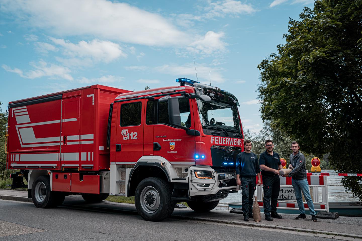 Aufgrund der bestehenden Hochwassersituation entschloss sich unser Planungsgremium, den neuen V-LKW direkt ins sprichwörtliche „Katastrophengebiet“ liefern zu lassen, anstatt ihn beim Aufbauhersteller Junghanns Fahrzeugbau in Hof abzuholen.