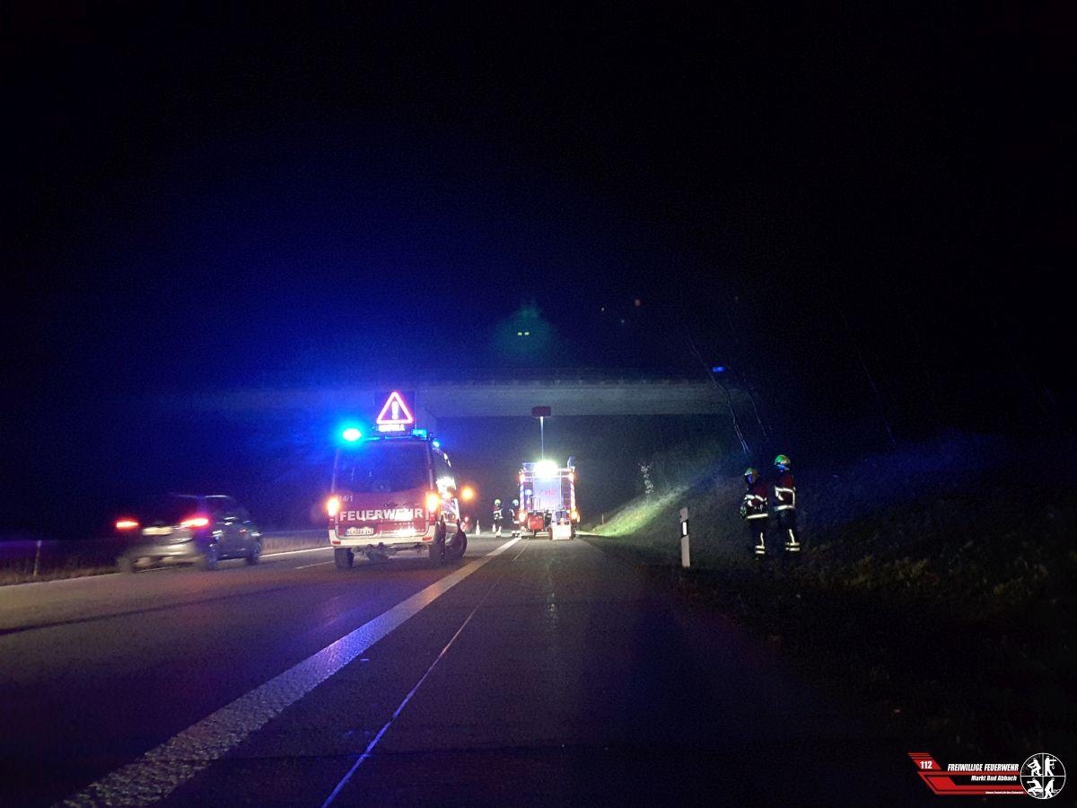 Zu unserem zweiten Einsatz am heutigen Sonntag wurden wir gegen halb sechs auf die Autobahn 93 Fahrtrichtung Regensburg zu einem Verkehrsunfall alarmiert. Wir banden auslaufende Betriebsstoffe und leiteten den Verkehr. Die Einsatzstelle wurde der Polizei übergben.