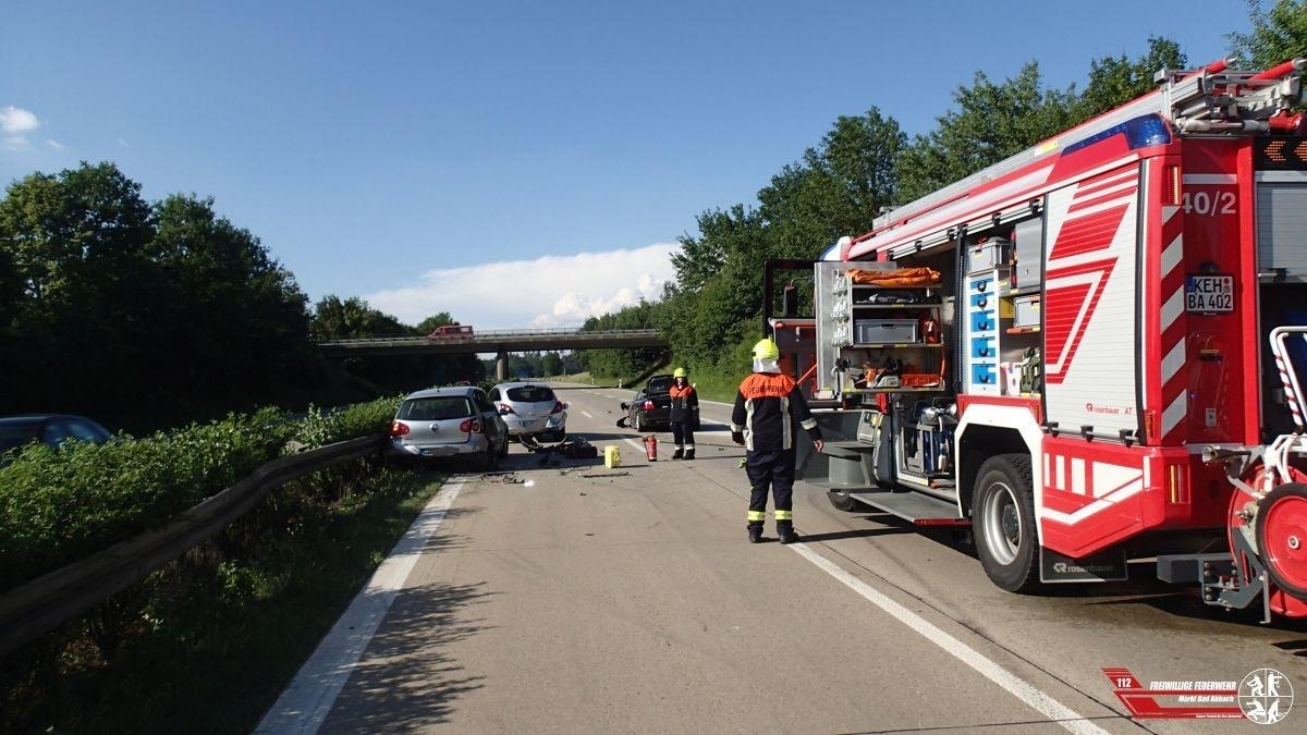 Zu einem Verkehrsunfall mit mehreren Pkw wurden wir auf die Autobahn 93 Fahrtrichtung Regensburg gegen 17:30 Uhr alarmiert. Der Einsatzleiter meldete zügig eine Lage, fünf Pkw waren an dem Unfall beteiligt, vier Pkw waren daraufhin nicht mehr fahrbereit und teils schwer beschädigt. Vier Personen wurden bei dem Unfall verletzt und durch mehrere Rettungswägen in umliegende Krankenhäuser verbracht. Die Unfallaufnahme der Polizei zog sich aufgrund der größeren Unfallstelle längere Zeit hin. Als diese beendet war, konnten die Fahrzeuge auf mehrere Abschleppwägen verlastet werden. Die Autobahn war für den kompletten Zeitraum komplett gesperrt, die Feuerwehr Teugn wurde nachalarmiert zum Ausleiten an der Anschlussstelle Bad Abbach.