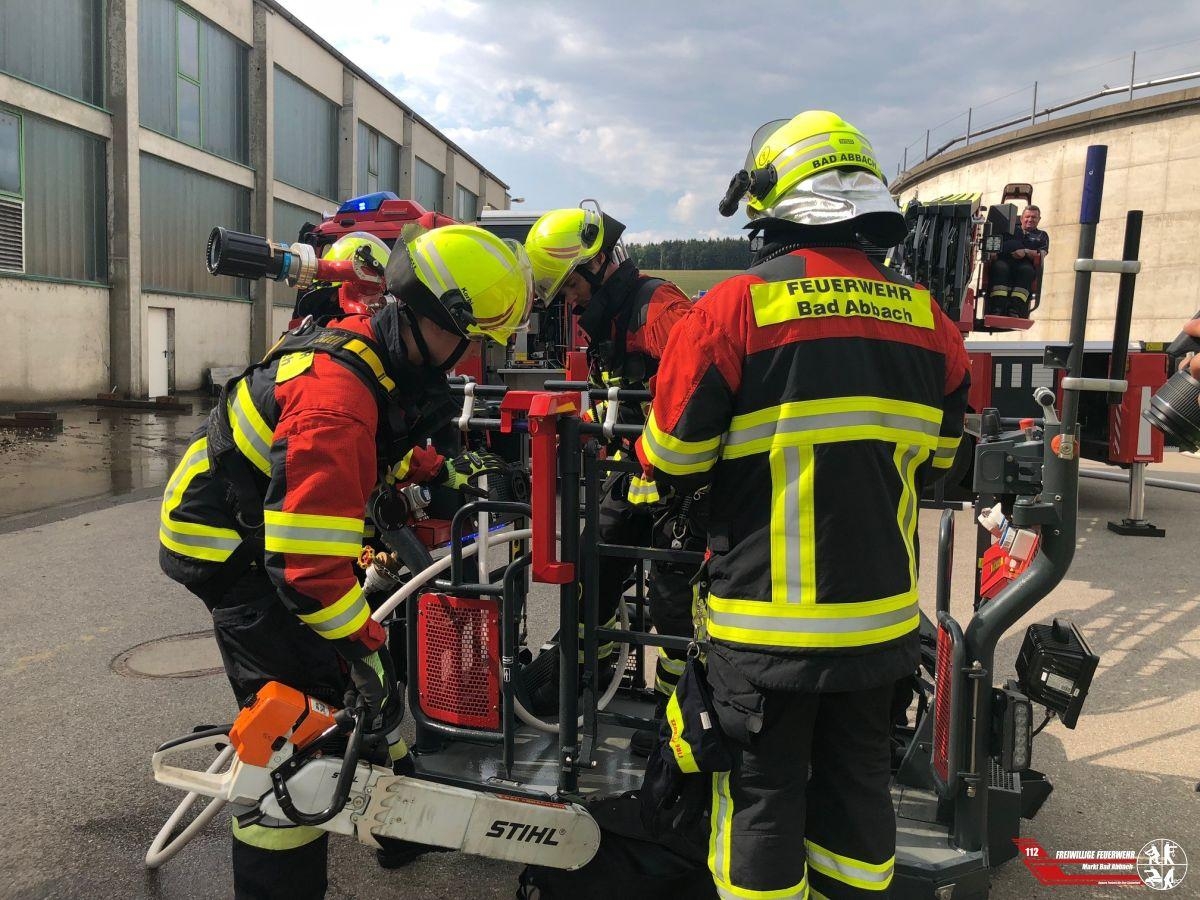 Die Einsatzleitung entschied nach einer detailierten Lagefeststellung das Dach in verschiedenen in der Wärmebildkamera auffälligen Bereichen zu öffnen. Mittels einer Blech-Motorsäge öffneten wir Teile der Dachhaut um gezielt den Brand bekämpfen zu können. Die Kameraden aus Kelheim unterstützten hierbei. Die restlichen Wehren stellten die Wasserversorgung von einem nahegelegenen Löschteich sicher.