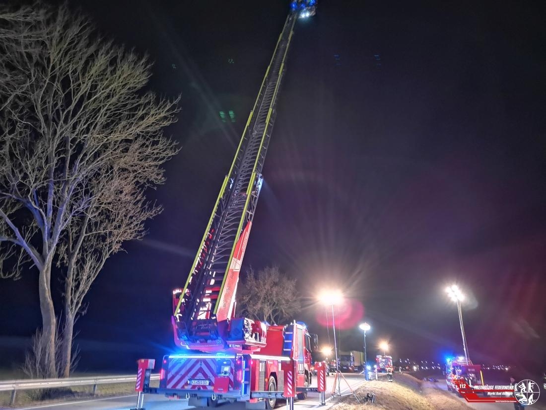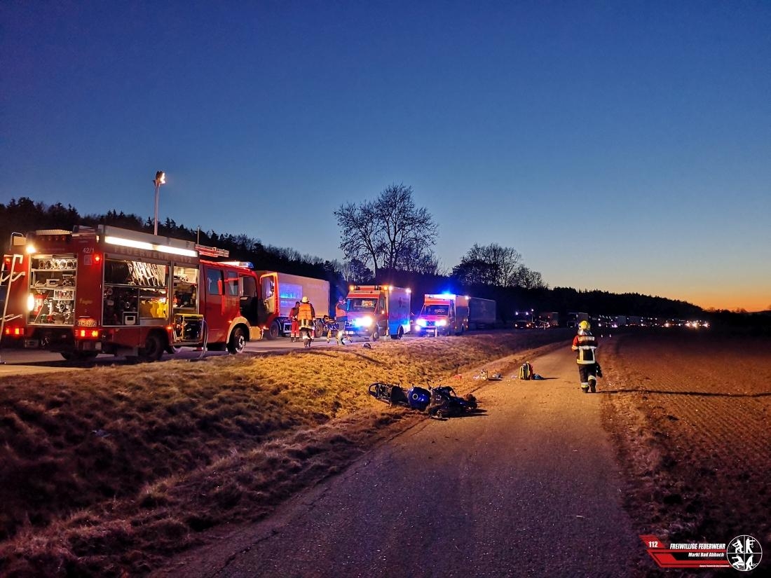 Um 17:40 Uhr wurde die Ortsteilfeuerwehr Lengfeld mit unserer Führung auf die Bundesstraße 16, Höhe Alkofen zu einem Verkehrsunfall mit einem Motorrad und mehreren Fahrzeugen alarmiert. Aus bisher ungeklärter Ursache kollidierte eine Zweiradfahrerin mit mehreren Fahrzeugen im Bereich der Abzweigung Fischbaum. Aufgrund des herrschenden Berufsverkehrs und der mit Trümmerteilen übersäten Fahrbahn wurden weitere Fahrzeuge unserer Wehr zur Unterstützung , Ausleuchtung und Verkehrsausleitung um 17:53 Uhr nachalarmiert. Eine große Anzahl an Rettungsdienstfahrzeugen aus dem Bereich Kelheim versorgten die schwerverletzte Zweiradfahrerin sowie weitere Unfallbeteiligte. Nach Eintritt der Dämmerung wurde in Abstimmung mit der Einsatzleitung ein Fahrzeug der Feuerwehr Teugn mit einem weiteren Lichtmastanhänger hinzugezogen. Zur Aufnahme und Unfallstellendokumentation von Oben kam unsere Drehleiter zum Einsatz. Aufgrund der Schwere des Unfalls wurde durch die Staatsanwaltschaft Regensburg ein Gutachter an die Einsatzstelle gerufen. Die Polizeiinspektion Kelheim nahm den Unfall auf. Gegen 22:45 Uhr konnte die Komplettsperre der Bundesstraße 16 wieder vollständig aufgehoben werden.