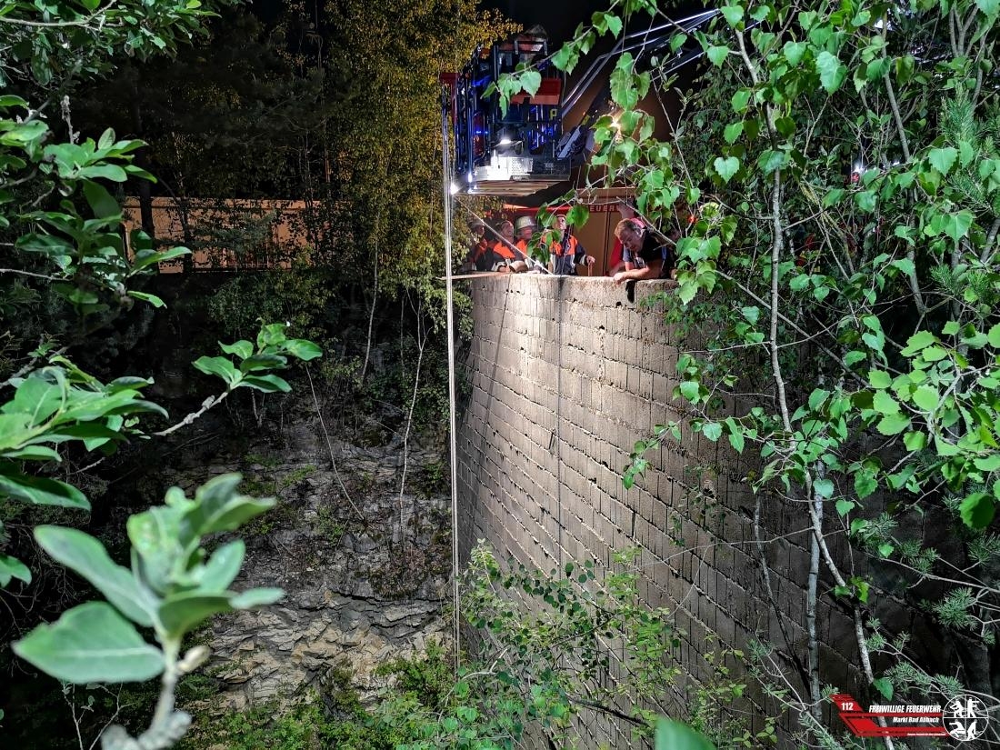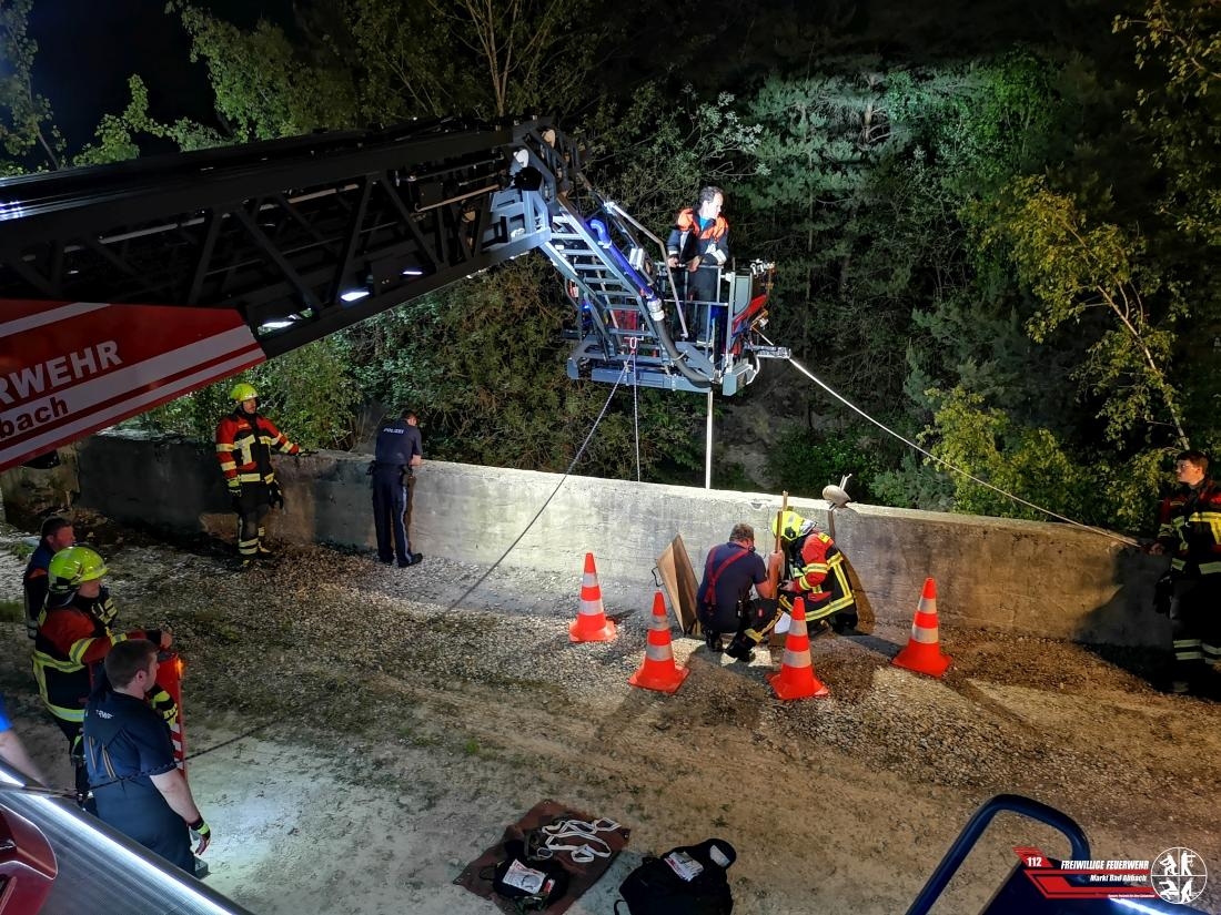 Gegen 21:30 Uhr alarmierte die Integrierte Leitstelle Landshut die Feuerwehren Poikam und Lengfeld mit dem Stichwort "Tierrettung, Hund fünf Meter abgestürzt" in die Kiesgrube nach Poikam. Ein Hund ist aus bisher ungeklärter Ursache einen circa 10 Meter tiefen Abgrund abgestürzt. Nach der ersten Erkundung durch den örtlich zuständigen Einsatzleiter wurde umgehend weiteres Gerät, unter anderem unsere Drehleiter nachalarmiert. Nachdem durch die Feuerwehren die Einsatzstelle ausgiebig ausgeleuchtet wurde, kam mit Hilfe unseres Hubrettungsgerätes der Gerätesatz Absturzsicherung zum Einsatz. Anschließend konnte ein Kamerad über einen Schacht sich Zugang zu dem Besitzer und dem verletzten Hund verschaffen. Das verletzte Tier wurde mittels Rettungsdreieck und die Hundeführerin mittels Brust-Sitzgurtkombination aus der Tiefe erfolgreich gerettet. Der Hund kam zur medizinischen Abklärung in eine Tierklinik.