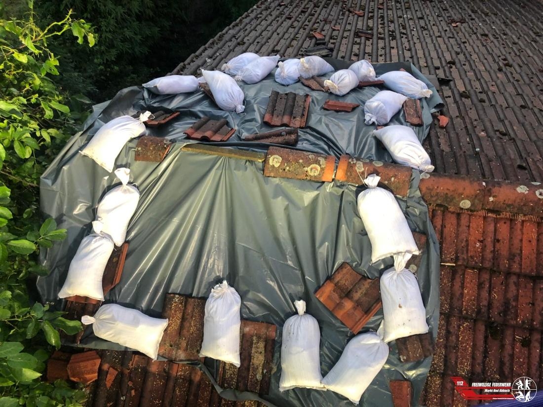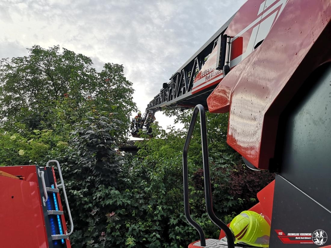 Zu einem Dachstuhlbrand wurden wir heute Abend um 18:26 Uhr in den Kalkofenring alarmiert. Nach einem kurzen, aber heftigen Unwetter mit mehreren Blitzeinschlägen hat es leider auch das Dach eines Wohnhauses erwischt. Mittels Drehleiter und Rettungssäge wurde die Dachhaut an der Einschlagstelle geöffnet und die Glutnester abgelöscht, sowie die verbrannte Dämmwolle ausgeräumt. Gleichzeitig befanden sich zwei Atemschutztrupps im Innenangriff. Ein Trupp war im Dachboden um die Brandbekämpfung von innen zu unterstützen, während der zweite Trupp das restliche Gebäude, sowie die Elektroverteilung kontrollierte. Die Feuerwehr Lengfeld wurde durch den Einsatzleiter mit weiteren Atemschutzträgern nachalarmiert. Der Energieversorger wurde ebenfalls verständigt um das Haus von der Elektroversorgung zu nehmen. Der örtliche Bauhof unterstütze uns bei den Arbeiten, um die geöffnete Stelle im Dach mittels einer Plane vor weiterem Regen bis zur Reparatur zu schützen. Aufgrund des Blitzeinschlags kam es auch in umliegenden Wohnhäusern zu elektronischen Schäden. Eine Person wurde dabei leicht verletzt und von den Kräften des Rettungsdienstes versorgt.