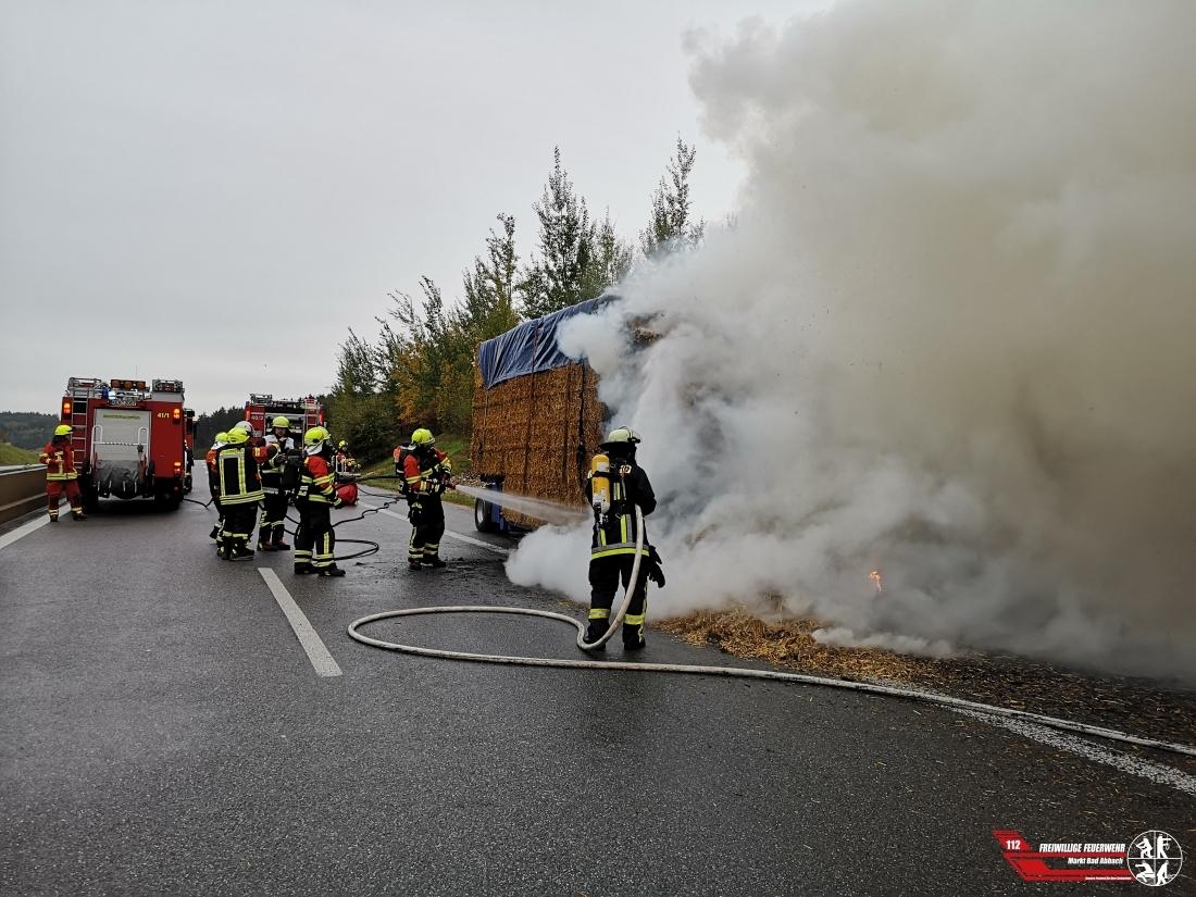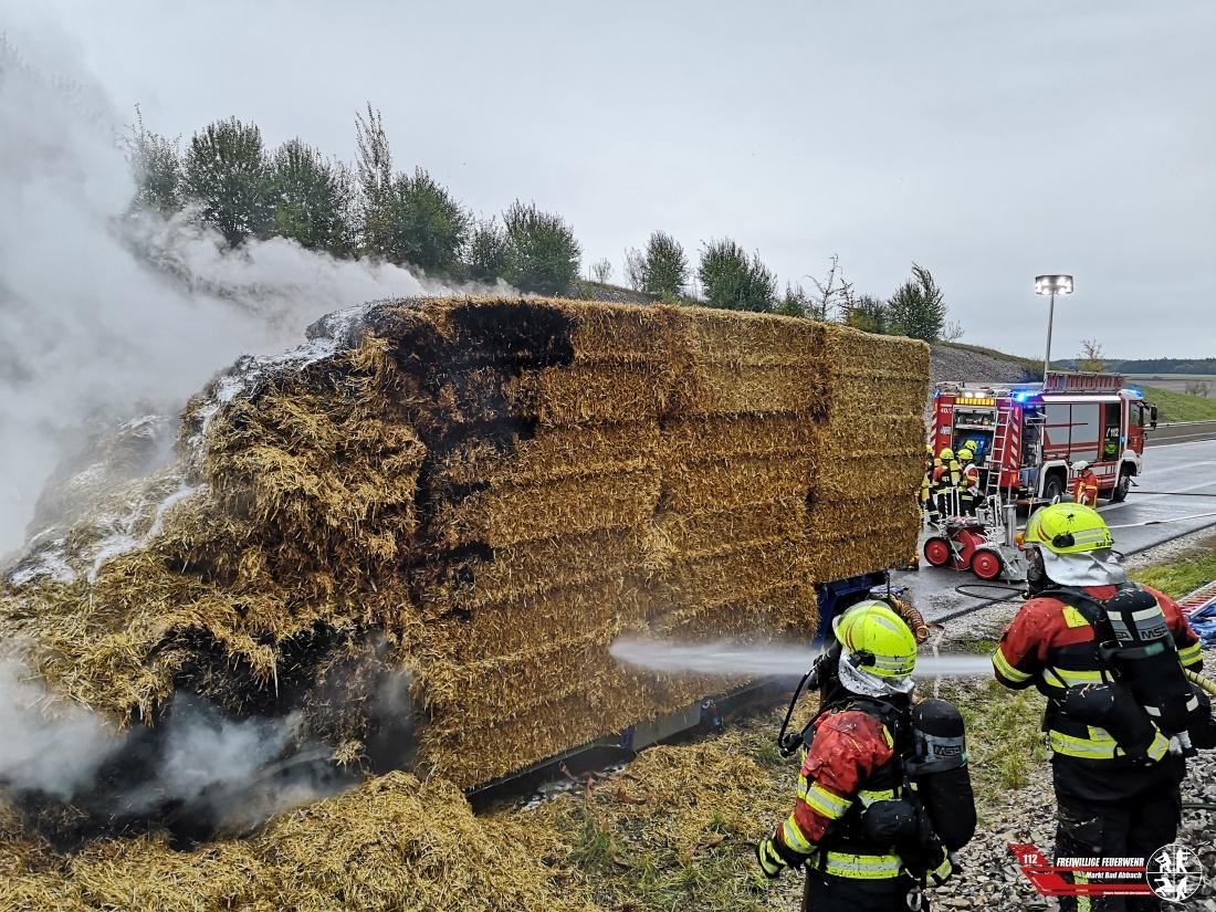 Gemeinsam mit den Feuerwehren Teugn, Hausen und Langquaid wurden wir zu einem mit Stroh beladenem brennenden Lkw alarmiert. Nach Eintreffen der ersten Löschfahrzeuge wurde umgehend mit der Brandbekämpfung des Anhängers begonnen. Zusätzlich wurden durch die Einsatzleitung noch mehrere TLF's der Feuerwehr Kelheim nachgefordert, mehrere Löschfahrzeuge fuhren zudem einen Pendelverkehr von Hydranten zur Einsatzstelle da eine große Menge Wasser benötigt wurde. Um das Stroh ablöschen zu können wurden ein großer Radlader, sowie ein Traktor zur Einsatzstelle beordert.
