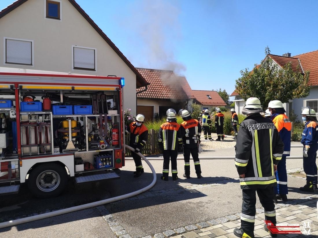 Auf dem Weg zu einem dienstlichen Termin kamen wir heute am frühen Nachmittag in Oberhinkofen als ersteintreffendes Rettungsmittel zu einem brennenden Pkw in einer Doppelgarage hinzu. Sofort wurde eine Erkundung durchgeführt und glücklicherweise waren bereits alle Bewohner im Freien. Die alarmierten zuständigen Feuerwehren übernahmen die Löscharbeiten, somit konnten wir unsere Fahrt fortsetzen.