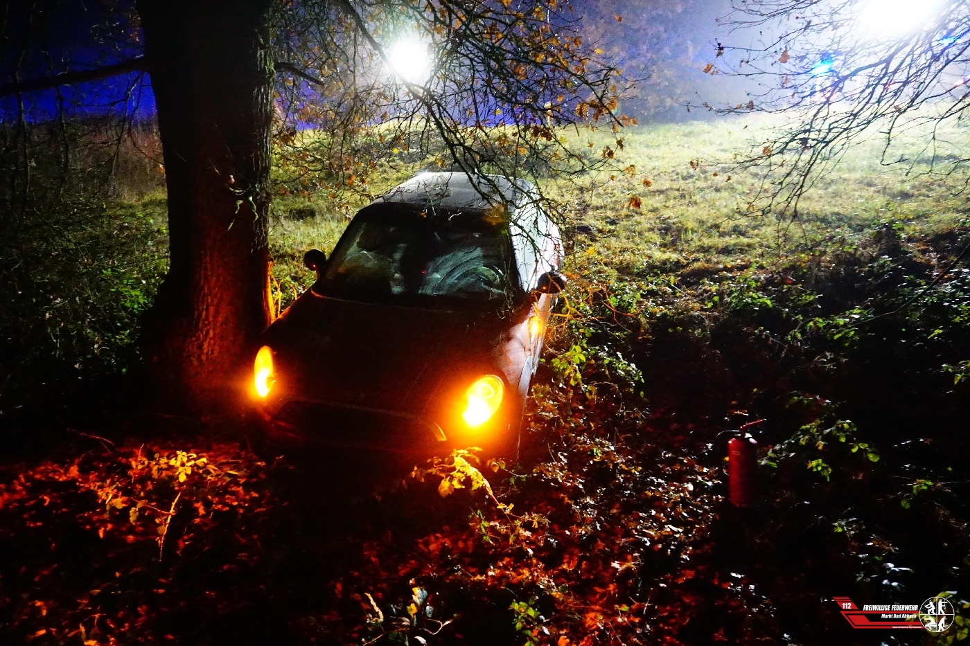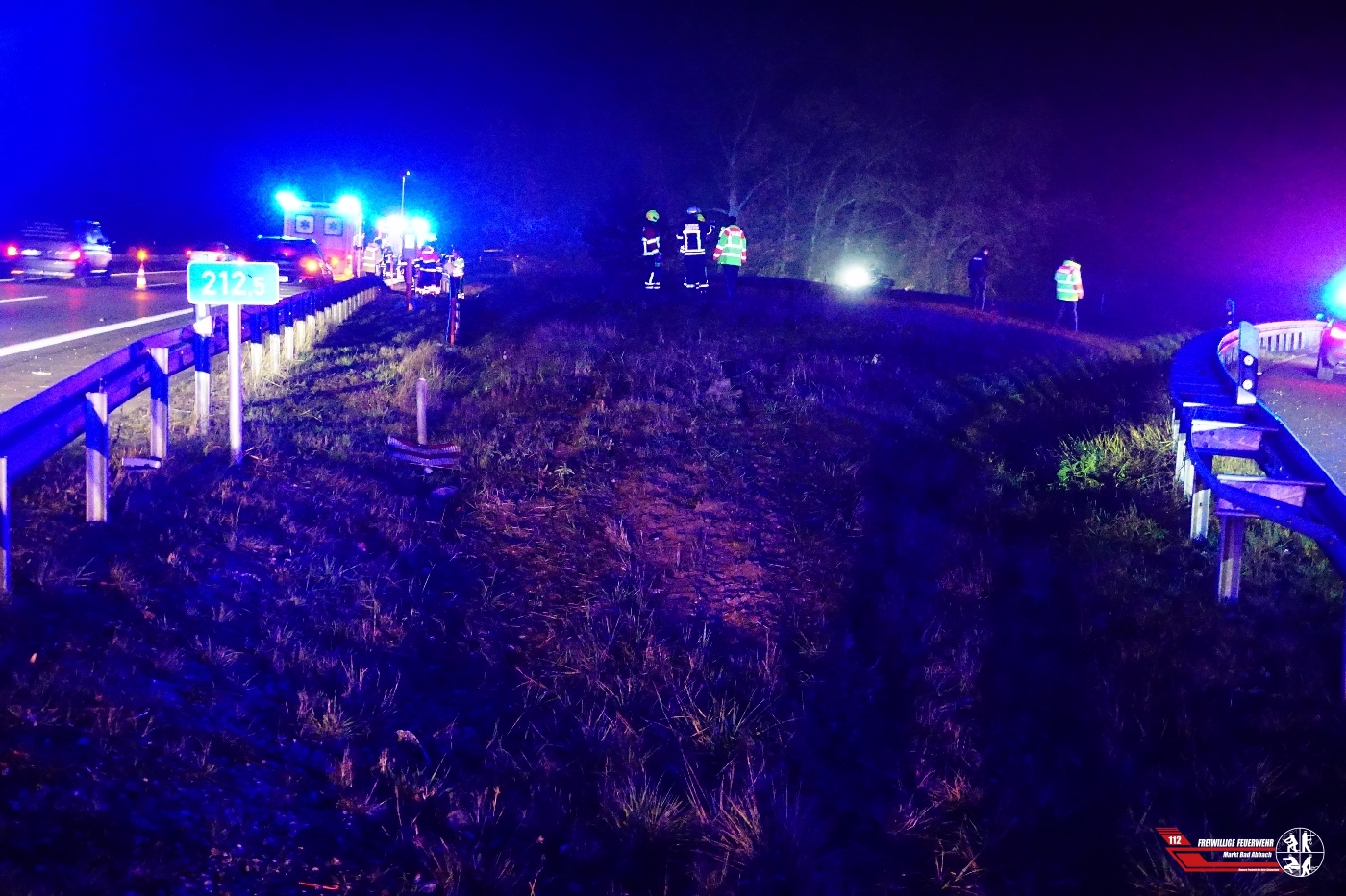 Zu einem Verkehrsunfall mit einer vermeintlich eingeklemmten Person wurden wir auf die Autobahn 93 Höhe Dreieck Saalhaupt alarmiert. Diese Meldung bestätigte sich vor Ort glücklicherweise nicht, die Person war nicht eingeklemmt. Die ebenfalls mitalarmierte Feuerwehr Teugn konnte die Anfahrt abbrechen. Der Fahrer des Fahrzeugs wurde verletzt und durch den mitalarmierten Rettungsdienst in ein nahegelegens Krankenhaus verbracht. Zum Unfallhergang können keine genaueren Angaben gemacht werden, lediglich dass das Fahrzeug rund 70m von der Fahrbahn entfernt in einem Abgrund stand. Für die Arbeiten des Bergeunternehmens wurde die Unfallstelle weitflächig ausgeleuchtet, sowie die Fahrbahn abgesichert.