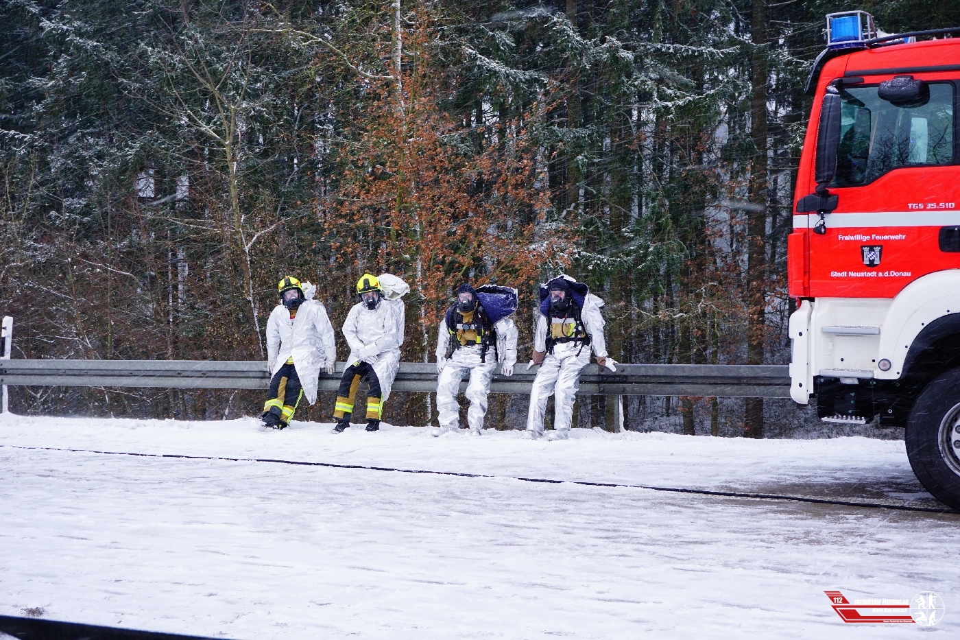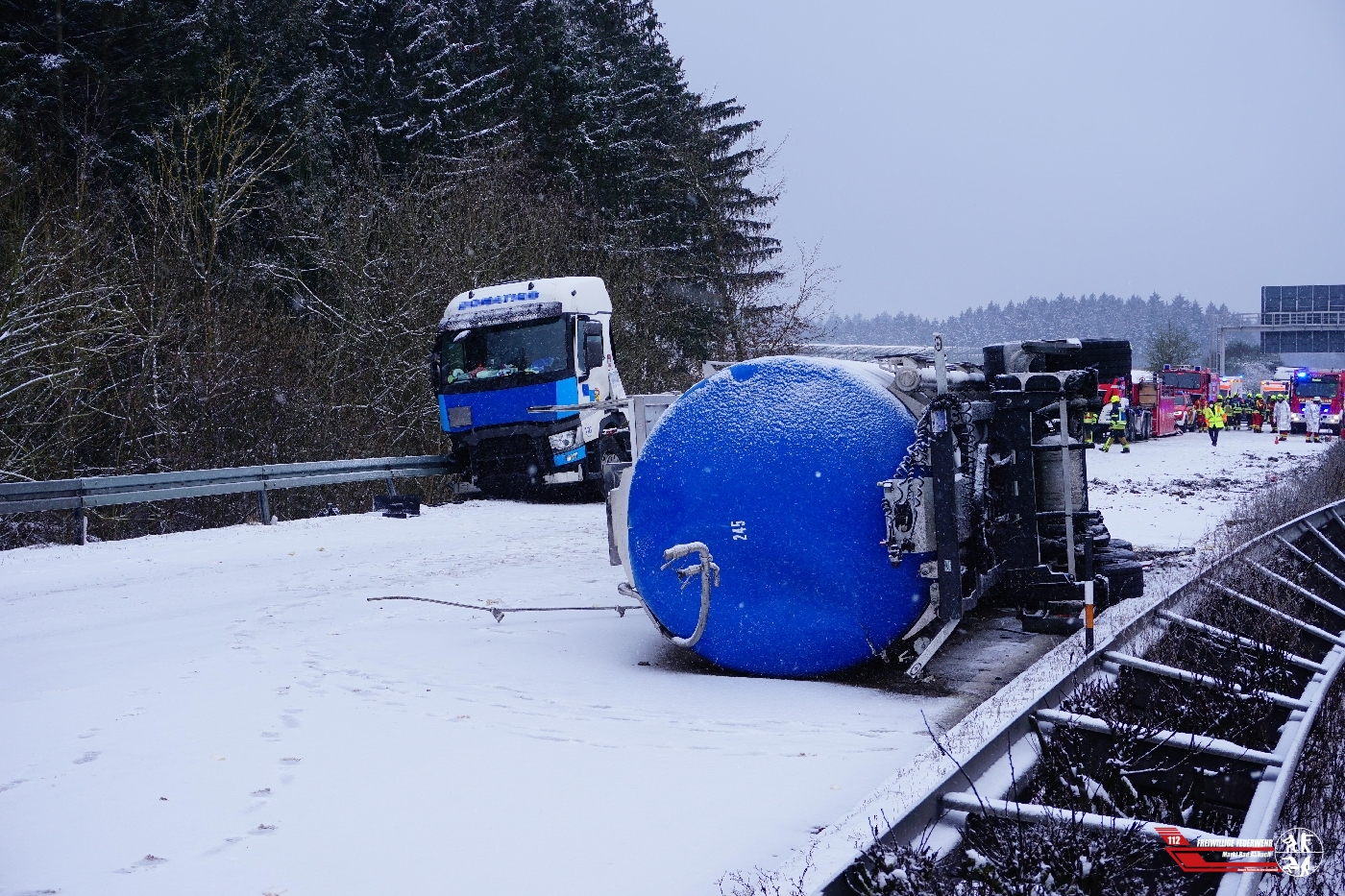 Kurz nach dem Erstalarm wurden wir im Rahmen des "Löschzug Gefahrgut" (LZ-G) erneut auf die Autobahn 93 alarmiert. Aus bislang unbekannter Ursache kam ein Gefahrgut Lkw ins Schleudern, dabei koppelte sich der Auflieger ab und kam in der Mittelleitplanke umgestürzt zum Liegen. Da anfangs nicht klar war, ob Gefahrgut austritt, wurde das Programm des LZ-G komplett aufgefahren. Durch die Feuerwehr Neustadt wurde der dreifache Brandschutz mittels AB-Sonderlöschmittel gestellt. Beladen ist der Tankzug mit mehreren tausend Liter Flüssigklebstoff, dieser wird durch eine Fachfirma aus Mannheim in einen anderen Tankzug umgepumpt. Wenn der umgestürzte Tankzug leer gepumpt wurde, kann eine Bergungsfirma aus Regensburg mit der Bergung des Sattelaufliegers beginnen. Die Autobahn 93 wird wohl noch einige Zeit in Fahrtrichtung Regensburg komplett gesperrt sein.