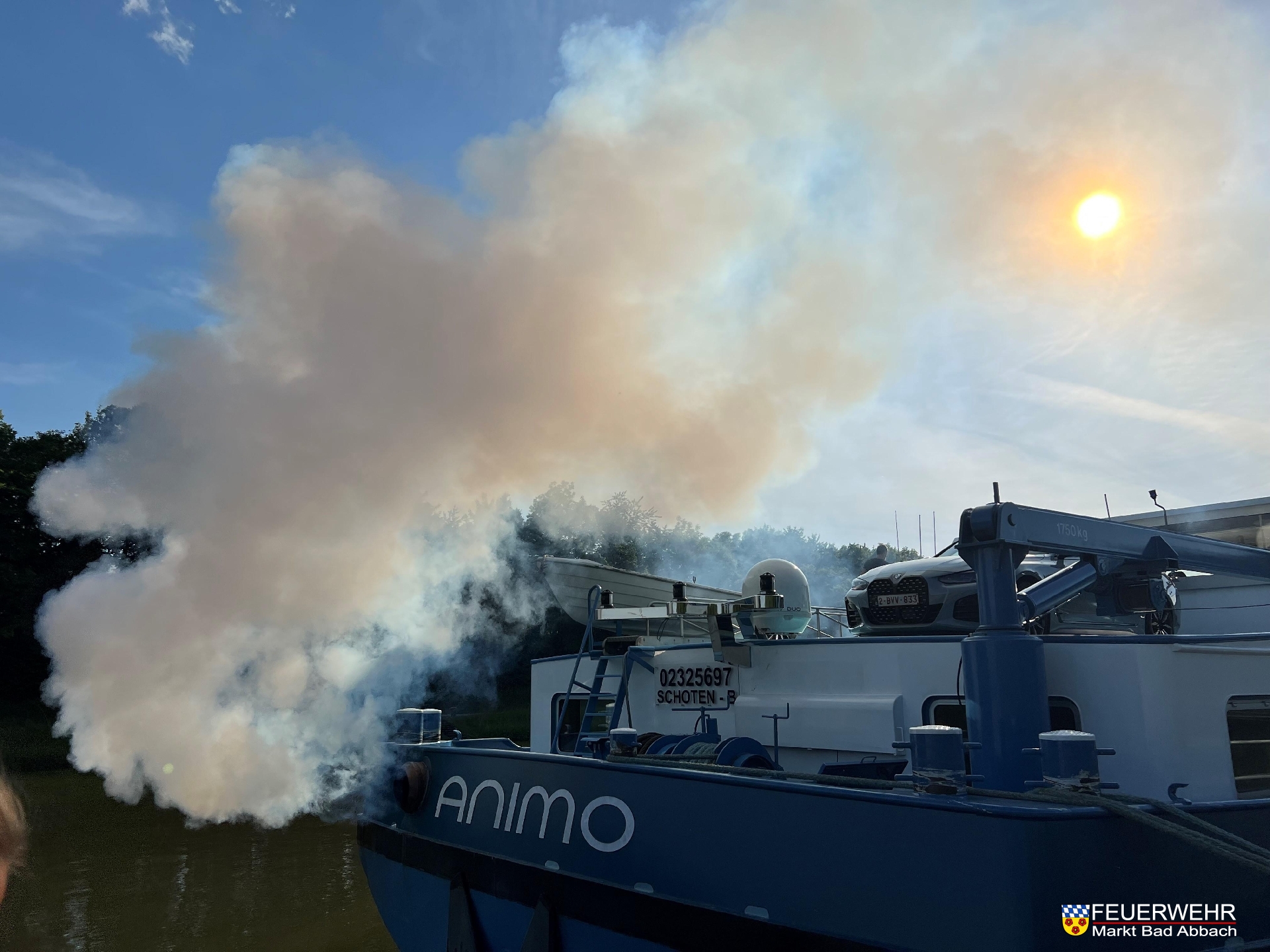 Nach zügiger Erkundung konnte schnell Entwarnung gegeben werden. Der Motor eine Güterschiffes verbrannte seinen Kraftstoff unvollständig, was zur massiven Verrauchung aus dem Auspuff führte.