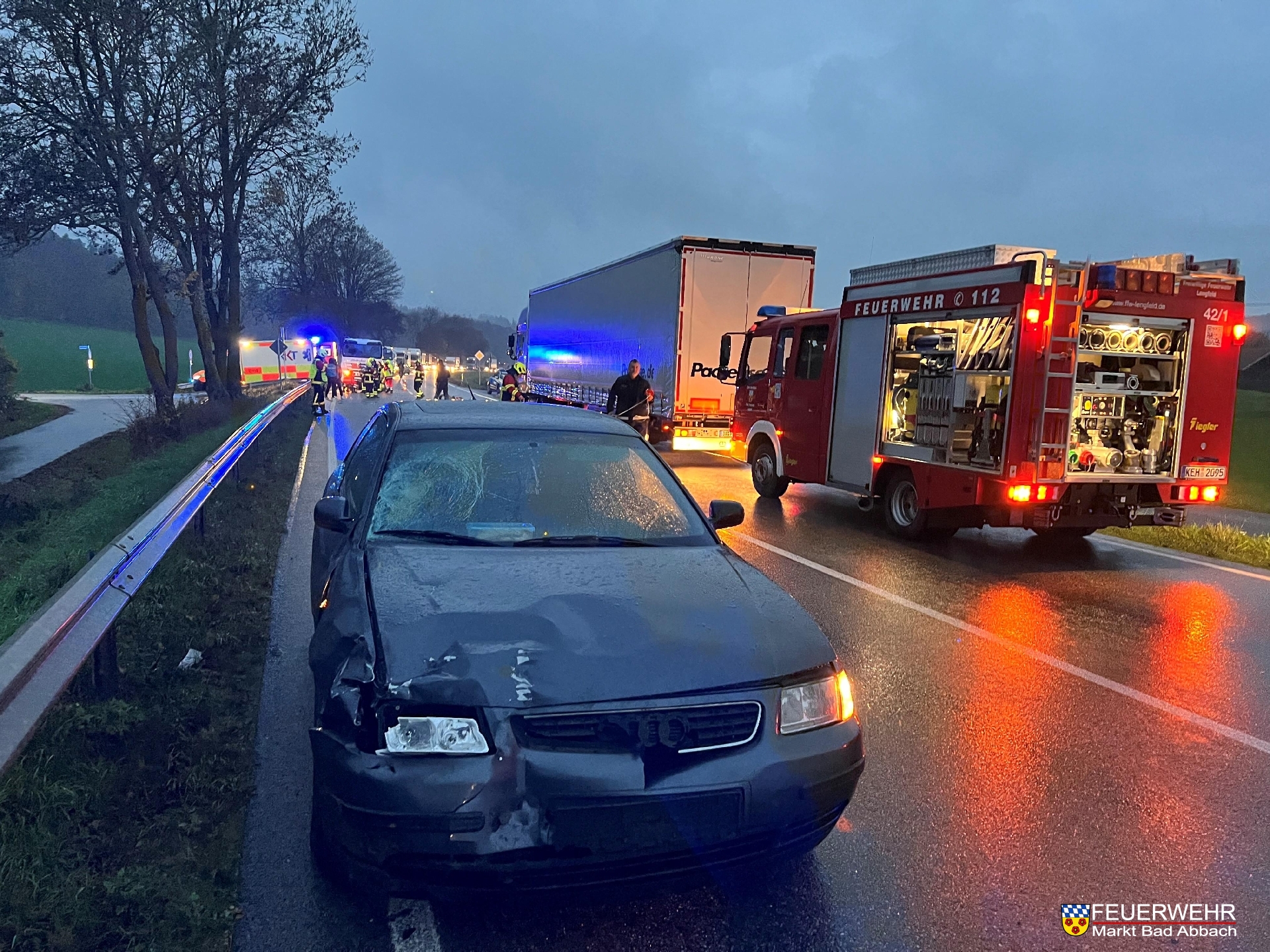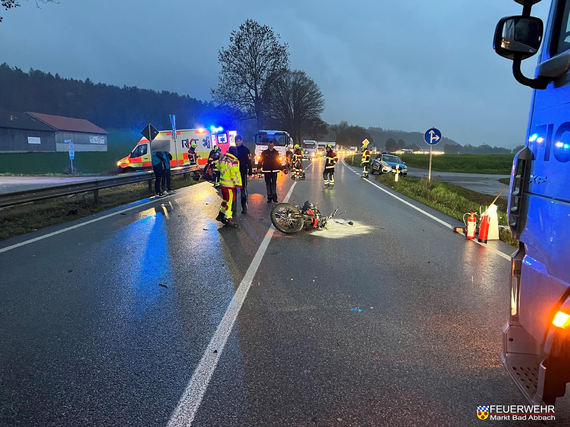 Aus ungeklärter Ursache kollidierte ein junger Kradfahrer mit einem Pkw der Marke Audi im Frontbereich. Der Fahrer des Motorrads wurde daraufhin verletzt. Aufgrund des hohen Verkehrsaufkommens wurden zur Komplettsperre unser und der Verkehrssicherungsanhänger der Feuerwehr Saal a.d. Donau nachalarmiert.