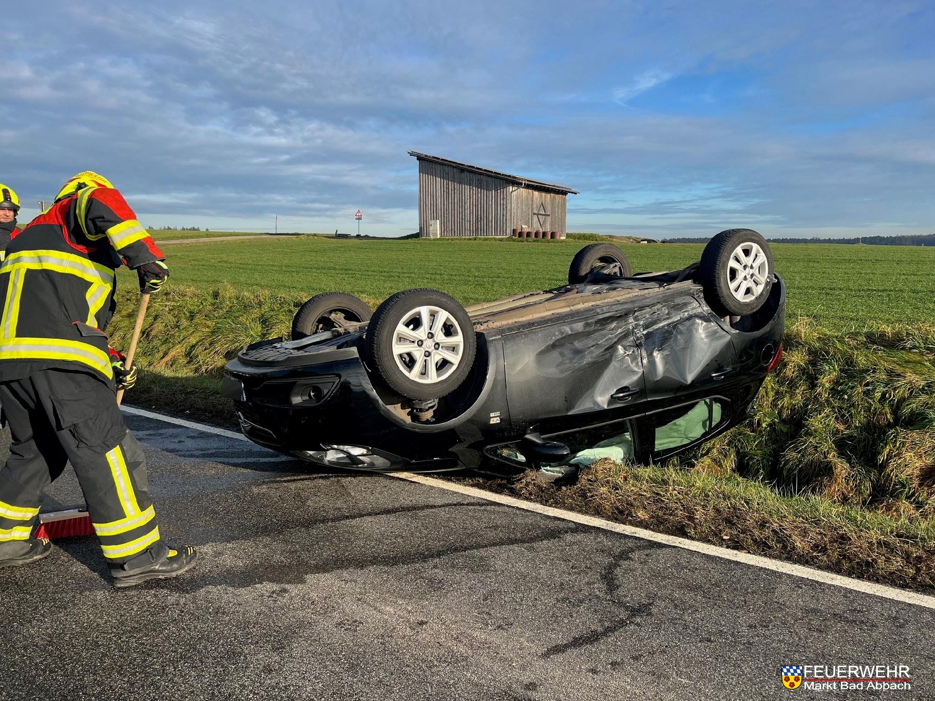 Zwei Kleinwägen kollidierten im Kreuzungsbereich. Hierbei geriet ein Fahrzeug außer Kontrolle, kam ins Schleudern und landete letztlich dachseitig in einem angrenzenden Straßengraben.