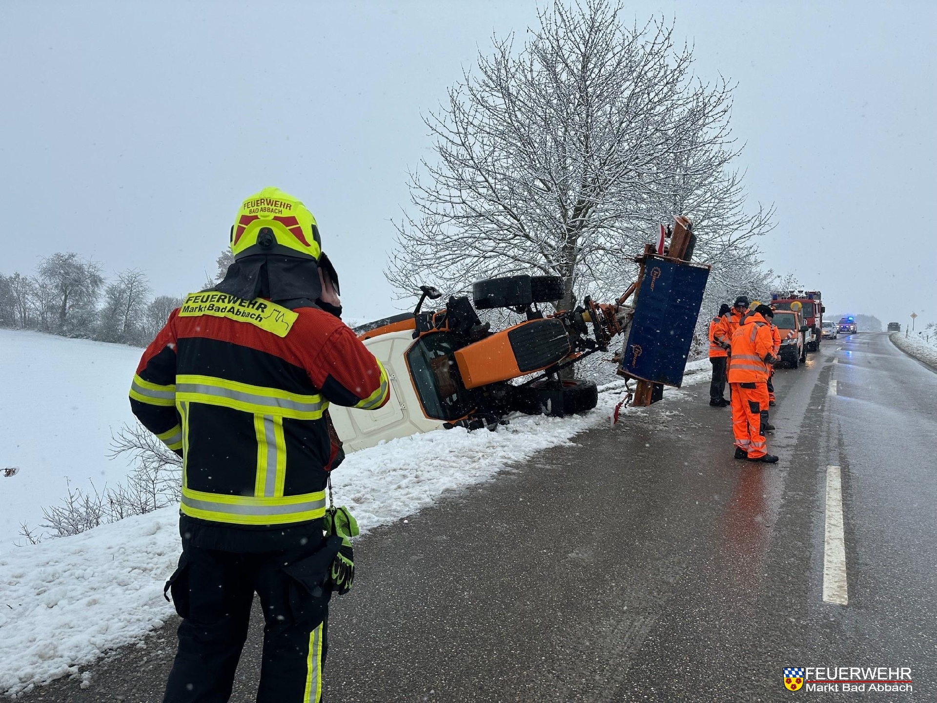 Der Fahrer eines Räumfahrzeuges verlor die Kontrolle und rutschte in den Graben und kippte darauhin zur Seite um.