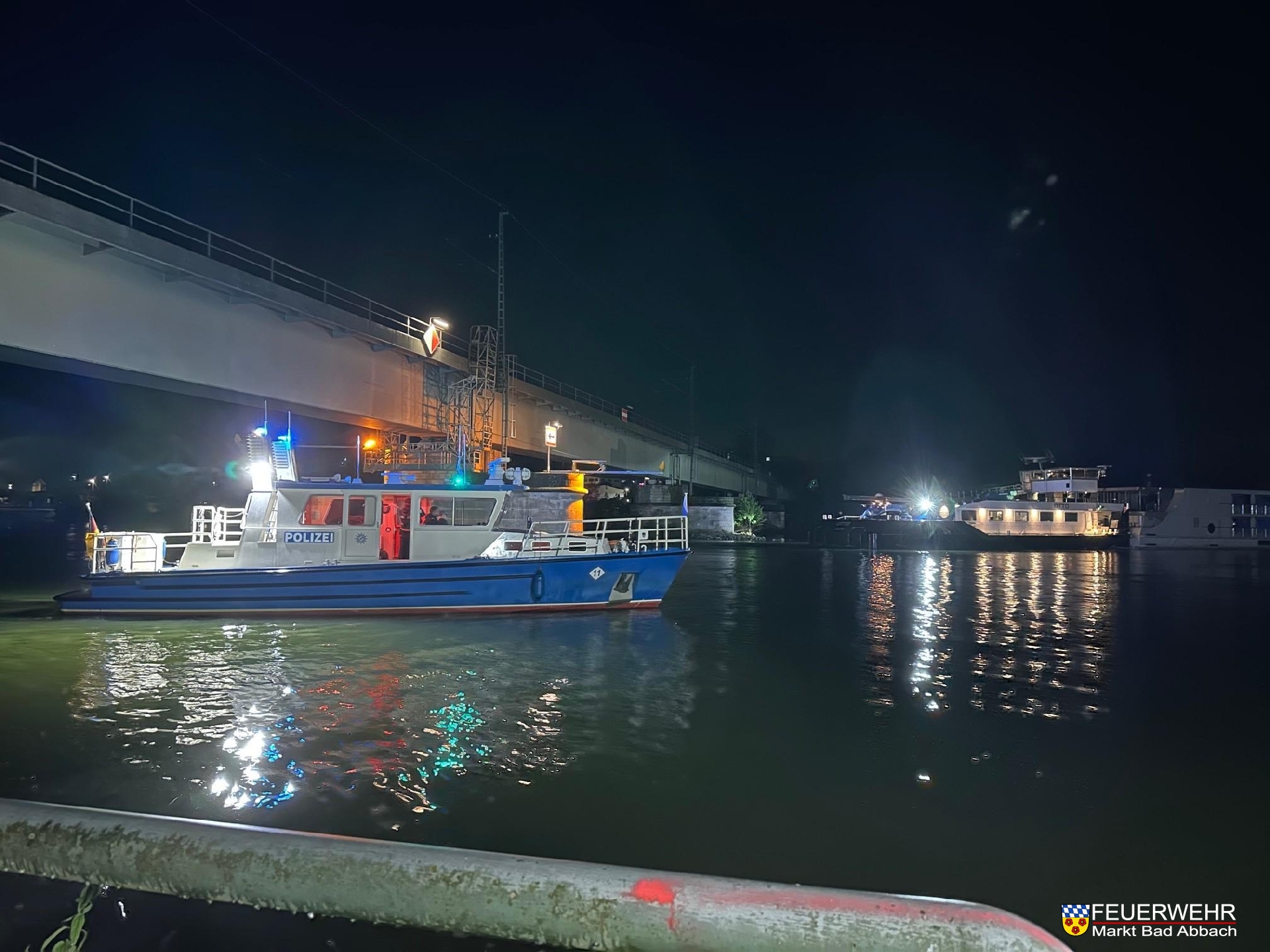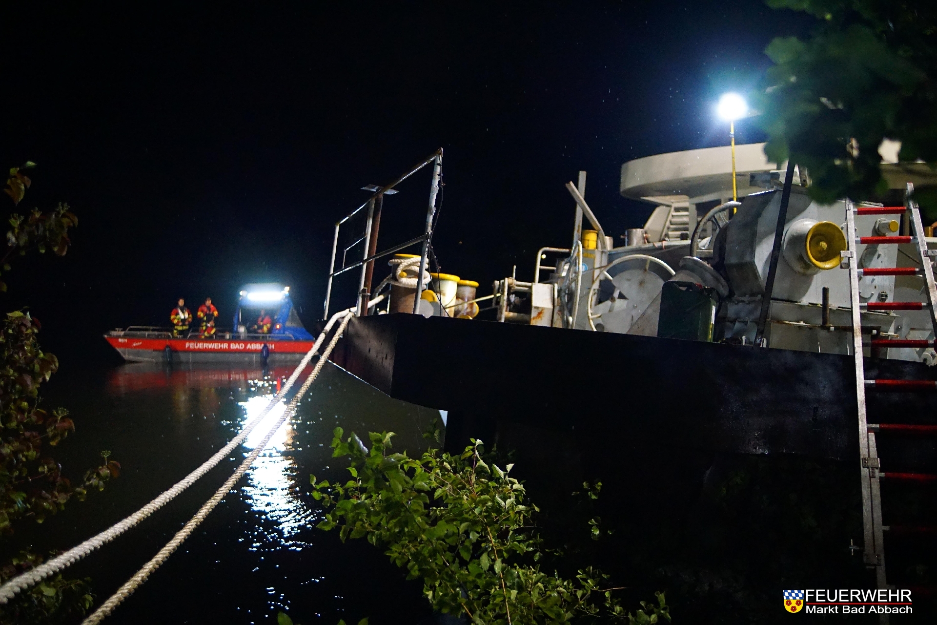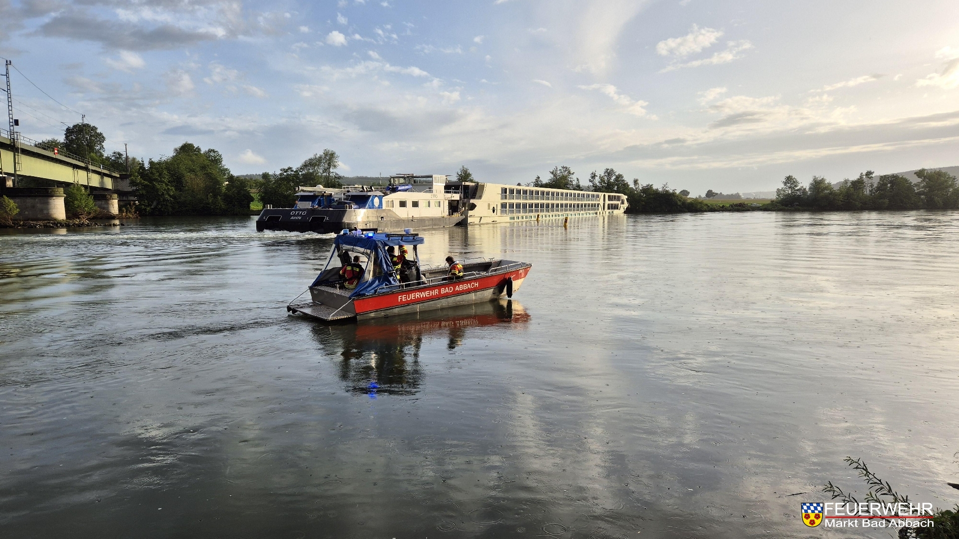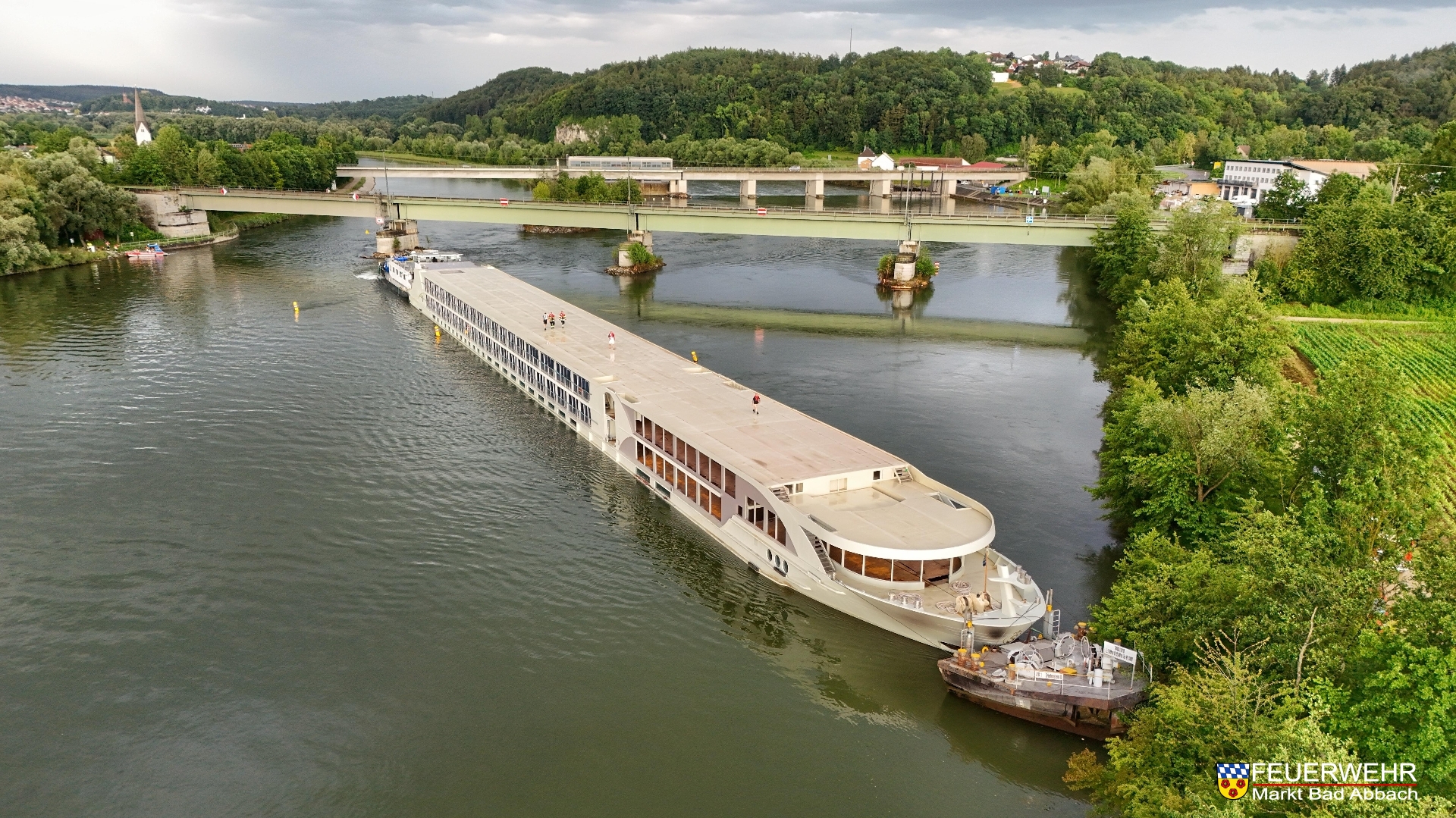 Ein noch nicht selbstständig fahrtüchtiges und nur mit der Crew besetztes Personenschiff, welches von einem Schleppschiff bewegt wurde, havarierte aufgrund eines technischen Problems im Bereich der Einfahrt zum Bad Abbacher Schleusenkanal. Der Kapitän konnte das etwa 130 Meter lange Schiff noch so manivrieren, dass es mit dem Ufer Kontakt schließen konnte und so vorerst keine weitere Gefahr ausging. Aufgrund des Defekts drang dichter Rauch aus dem vorderen Maschinenraum. Ein Trupp unter schwerem Atemschutz stieg hinab, erkundete die Situation und konnte kein offenes Feuer feststellen. Eine Entrauchung wurde durchgeführt.
