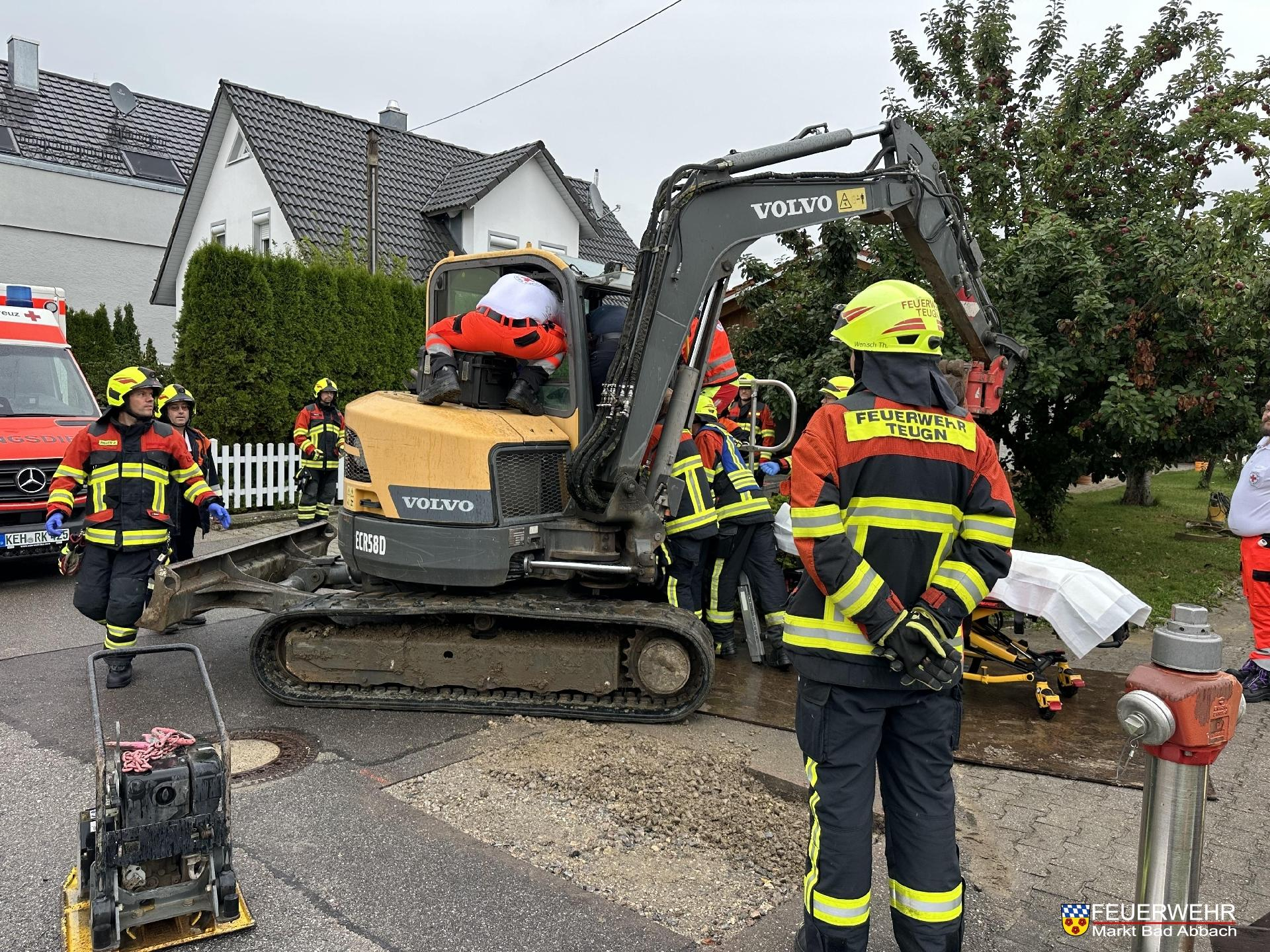 Eine erkrankte Person musste zur weiteren notärztlichen Behandlung, mit Hilfe einer Rettungsplattform, aus einer Baumaschine gerettet werden.