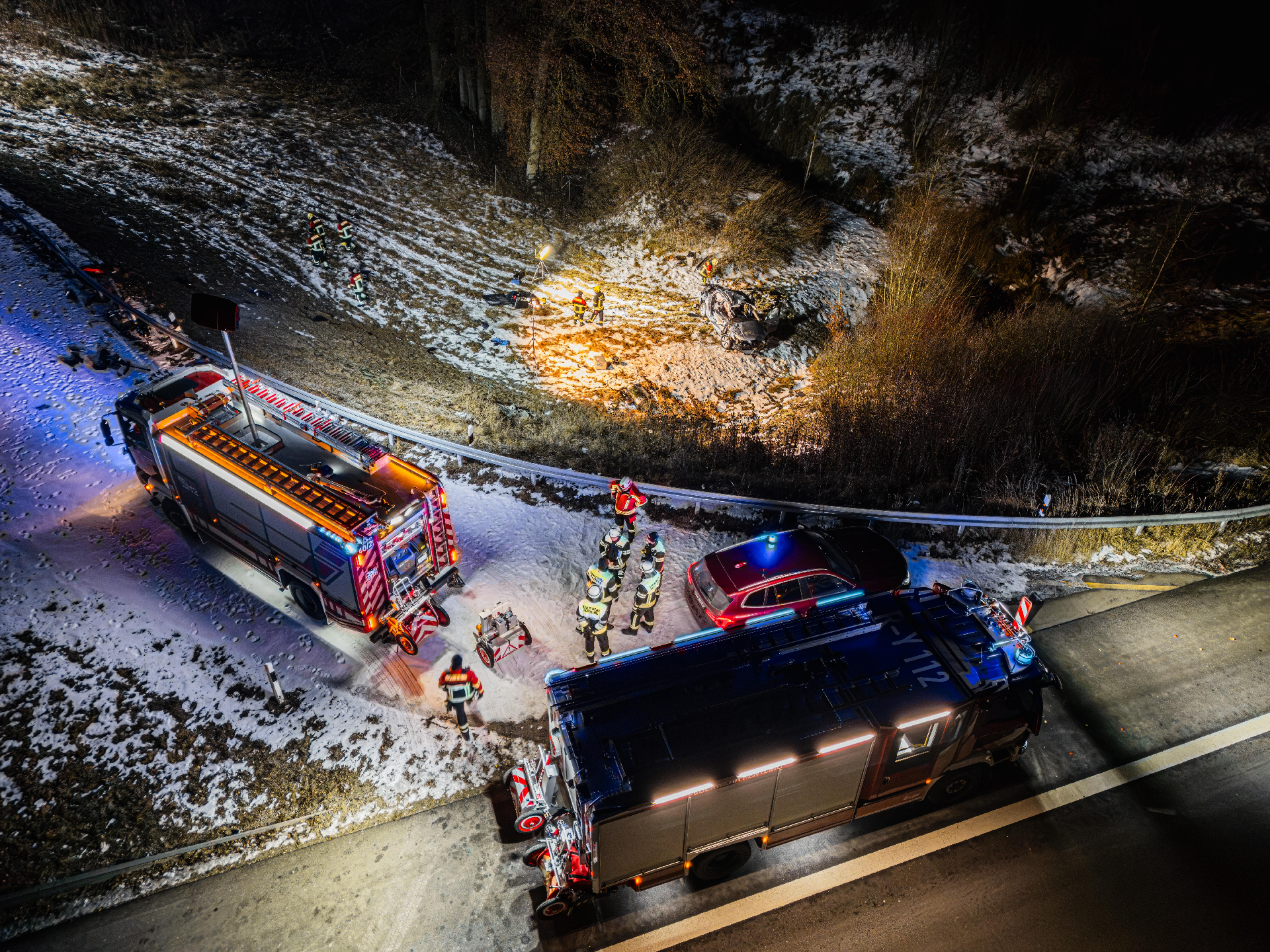 Eine zügige Erkundung unseres Führungsdienstgrads bestätigte die Situation. Ein alleinbeteiligtes Fahrzeug der Marke VW, kam aus bisher ungeklärter Ursache im Bereich der Überleitung auf die Bundesstraße 15 von der Fahrbahn ab, überschlug sich mehrfach im angrenzenden Grünbereich, hob über eine Leitplanke ab und überschlug sich bzw. rollte weiter hinab in ein rund 10 Meter tiefer gelegenes Regenrückhaltebecken, ehe es auf allen vier Reifen wieder zum Stehen kam.