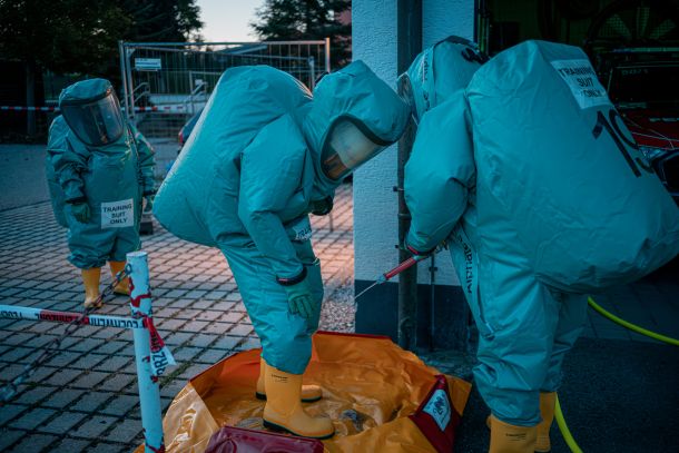 Chemikalienschutzanzüge (CSA) kommen bei Gefahrgutunfällen zum Einsatz. Der Träger des CSA ist dabei komplett von seiner Umwelt isoliert und kann damit in biologisch oder chemisch kontaminierten Bereichen arbeiten.