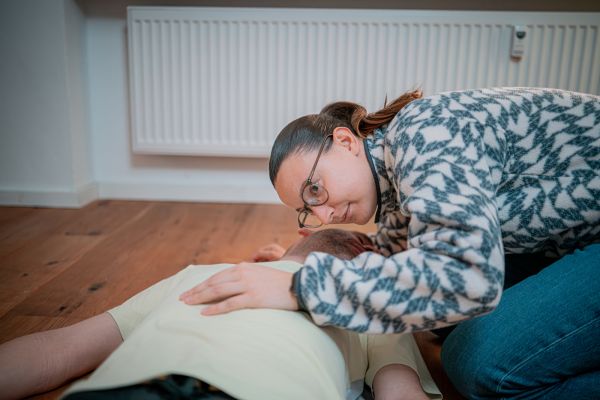 Auf Anweisung und Begleitung durch den Disponenten der Integrierten Leitstelle beginnt die Angehörige mit der Herz-Lungen-Wiederbelebung und drückt dabei mit ihrem Handballen die Mitte des Brustkorbs circa 4-5 Zentimeter ein und entlastet diesen. Dieser Vorgang sollte mit einer Frequenz von circa 100 Kompressionen pro 60 Sekunden gleichmäßig bis zum Eintreffen und der Übernahme der Rettungskräfte fortgesetzt werden.