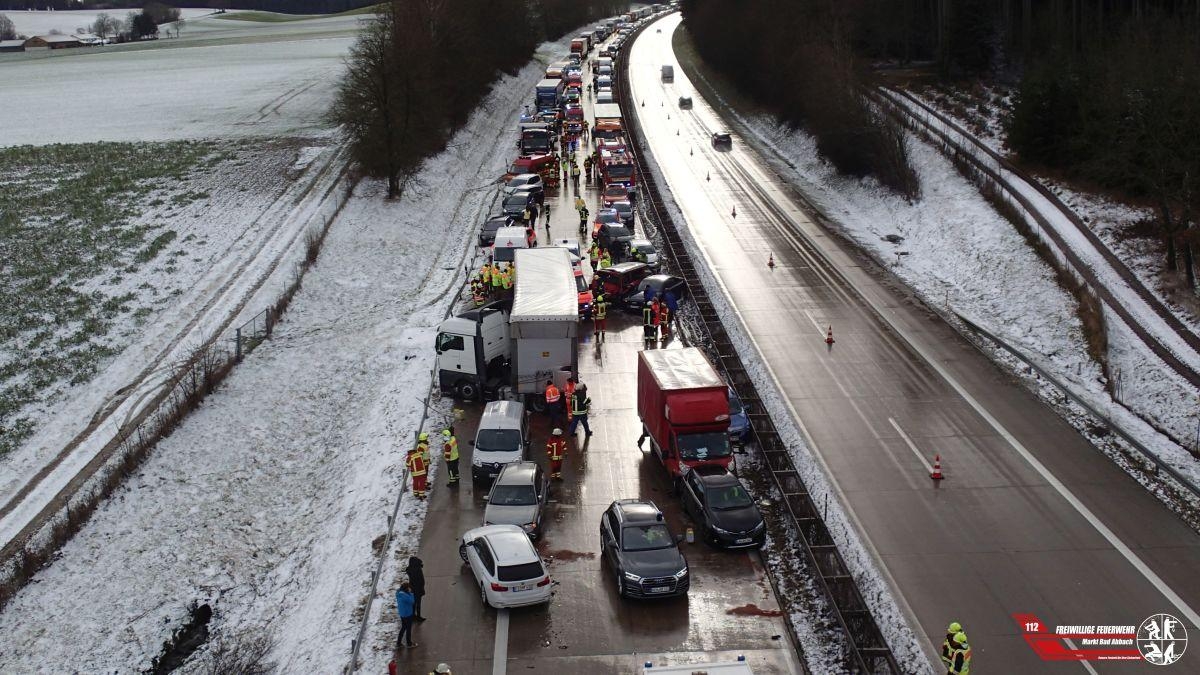 Gegen 12:15 Uhr wurden wir zur Verkehrsleitung nach einer Massenkarambolage auf die Autobahn 93 zwischen den Anschlussstellen Bad Abbach und Saalhaupt alarmiert. Auf der Gegenspur in Fahrtrichtung Regensburg ereignete sich ein Verkehrsunfall mit gemeldeten 17 Pkw und 2 Lkw. Wir sicherten den linken Fahrstreifen in Fahrtrichtung München ab und unterstützten die Polizei für Dokumentationszwecke mit der Drehleiter.