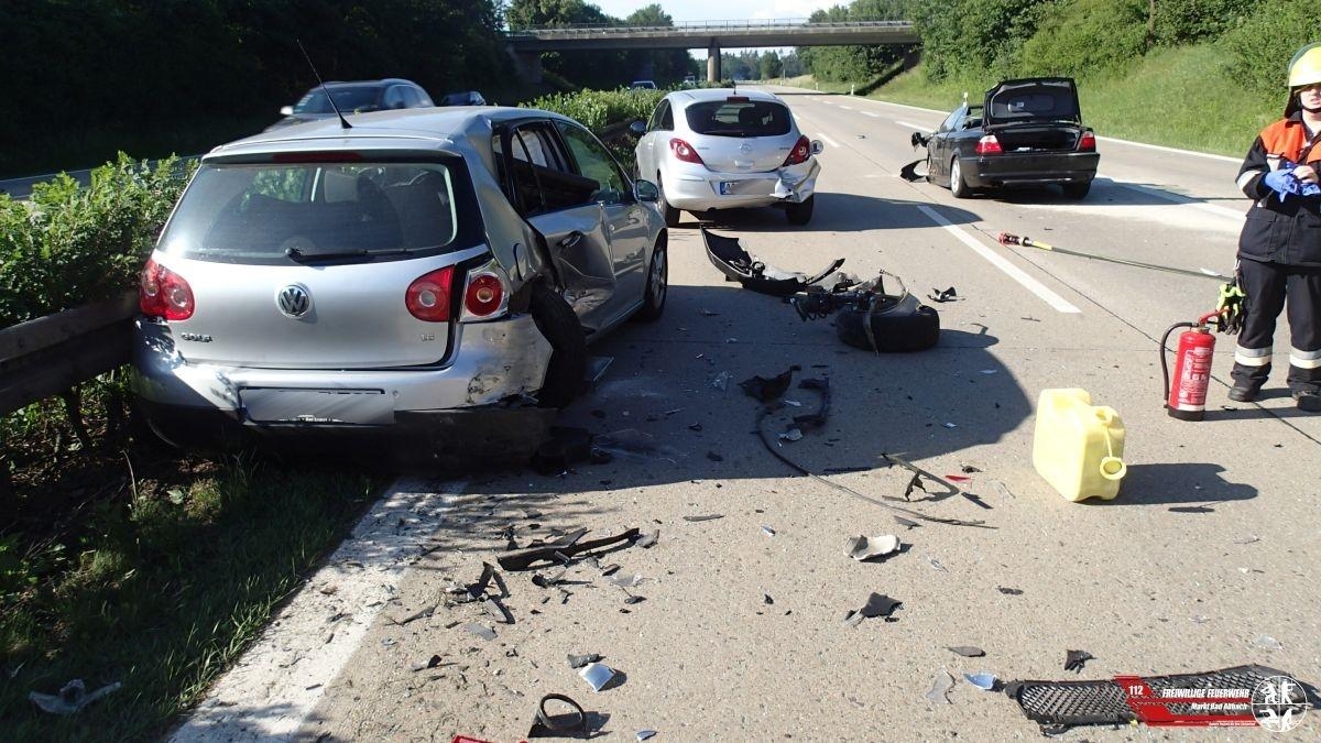 Zu einem Verkehrsunfall mit mehreren Pkw wurden wir auf die Autobahn 93 Fahrtrichtung Regensburg gegen 17:30 Uhr alarmiert. Der Einsatzleiter meldete zügig eine Lage, fünf Pkw waren an dem Unfall beteiligt, vier Pkw waren daraufhin nicht mehr fahrbereit und teils schwer beschädigt. Vier Personen wurden bei dem Unfall verletzt und durch mehrere Rettungswägen in umliegende Krankenhäuser verbracht. Die Unfallaufnahme der Polizei zog sich aufgrund der größeren Unfallstelle längere Zeit hin. Als diese beendet war, konnten die Fahrzeuge auf mehrere Abschleppwägen verlastet werden. Die Autobahn war für den kompletten Zeitraum komplett gesperrt, die Feuerwehr Teugn wurde nachalarmiert zum Ausleiten an der Anschlussstelle Bad Abbach.