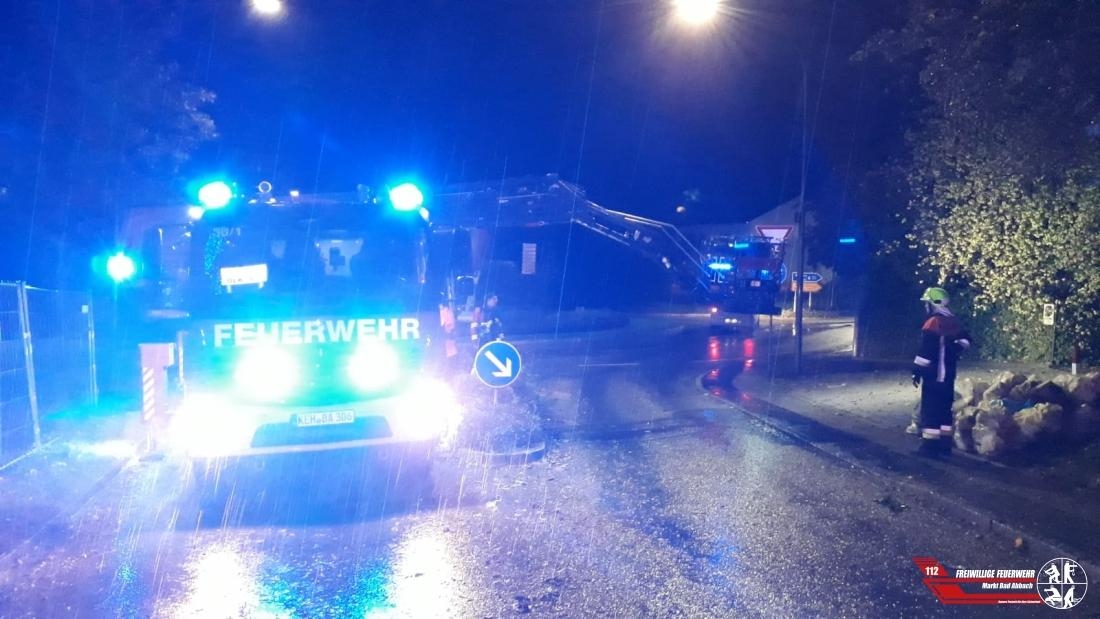 Es musste ein auf ein Gebäude gestürzter Baum mittels der Drehleiter beseitigt werden.
