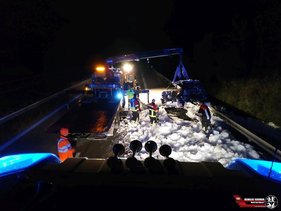 Am heutigen Donnerstagabend wurden wir gemeinsam mit der Feuerwehr Pentling zu einem brennenden Pkw auf die Autobahn 93 zwischen Bad Abbach und Saalhaupt alarmiert. Bereits bei Eintreffen stand der Pkw der Marke MINI in Vollbrand. Mittels massivem Schaumeinsatz konnte das Fahrzeug abgelöscht werden, durch die enorme Hitze öffnete sich der Fahrzeugtank und verschmutzte die Straße somit mit einem Öl-Benzin-Gemisch. Weshalb eine Firma aus Wolnzach mit einem Spezialfahrzeug beauftragt wurde um die Straße zu reinigen. Die Autobahn musste zwischen den Anschlussstellen Bad Abbach und Saalhaupt für mehrere Stunden komplett gesperrt werden. Der mitalarmierte Rettungsdienst musste glücklicherweise nicht eingreifen. Das komplett ausgebrannte Fahrzeug wurde durch ein Abschleppunternehmen abtransportiert.