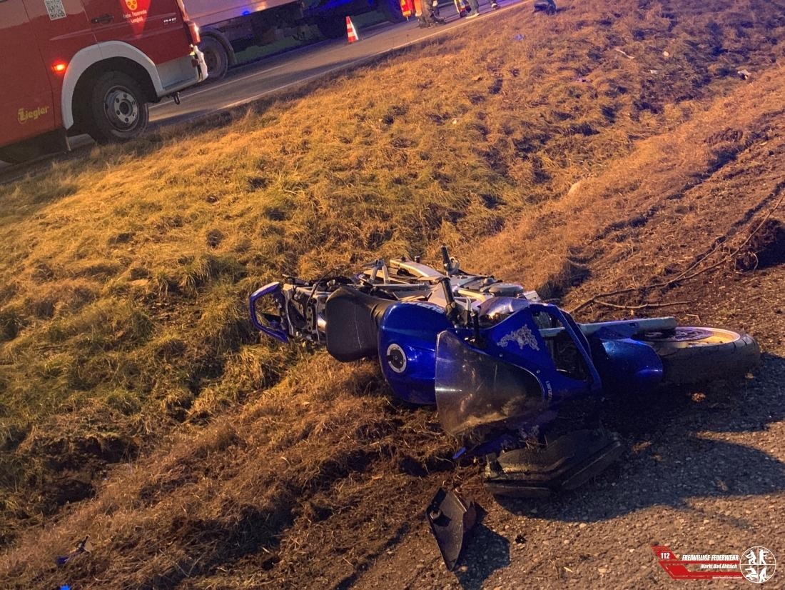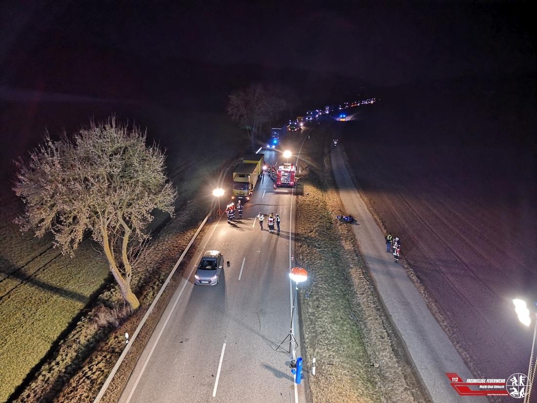 Um 17:40 Uhr wurde die Ortsteilfeuerwehr Lengfeld mit unserer Führung auf die Bundesstraße 16, Höhe Alkofen zu einem Verkehrsunfall mit einem Motorrad und mehreren Fahrzeugen alarmiert. Aus bisher ungeklärter Ursache kollidierte eine Zweiradfahrerin mit mehreren Fahrzeugen im Bereich der Abzweigung Fischbaum. Aufgrund des herrschenden Berufsverkehrs und der mit Trümmerteilen übersäten Fahrbahn wurden weitere Fahrzeuge unserer Wehr zur Unterstützung , Ausleuchtung und Verkehrsausleitung um 17:53 Uhr nachalarmiert. Eine große Anzahl an Rettungsdienstfahrzeugen aus dem Bereich Kelheim versorgten die schwerverletzte Zweiradfahrerin sowie weitere Unfallbeteiligte. Nach Eintritt der Dämmerung wurde in Abstimmung mit der Einsatzleitung ein Fahrzeug der Feuerwehr Teugn mit einem weiteren Lichtmastanhänger hinzugezogen. Zur Aufnahme und Unfallstellendokumentation von Oben kam unsere Drehleiter zum Einsatz. Aufgrund der Schwere des Unfalls wurde durch die Staatsanwaltschaft Regensburg ein Gutachter an die Einsatzstelle gerufen. Die Polizeiinspektion Kelheim nahm den Unfall auf. Gegen 22:45 Uhr konnte die Komplettsperre der Bundesstraße 16 wieder vollständig aufgehoben werden.