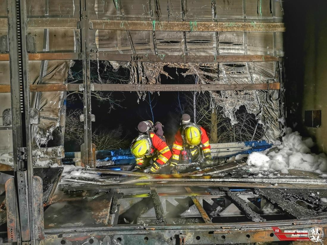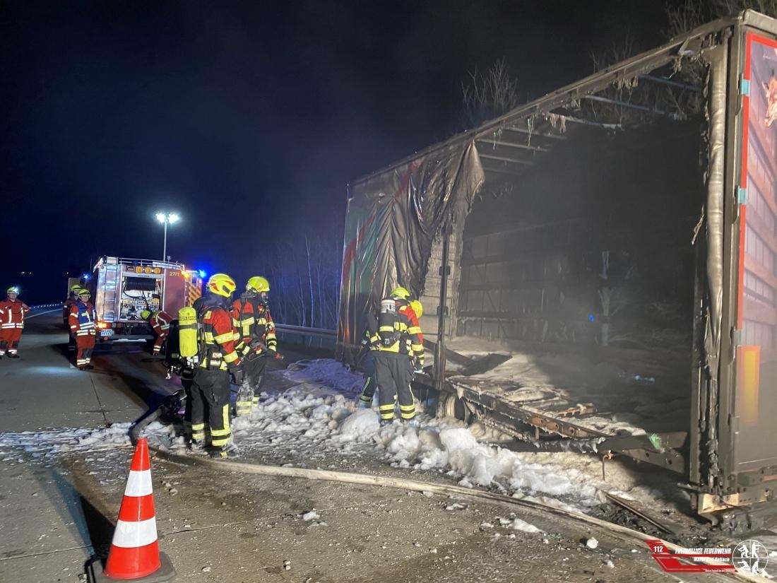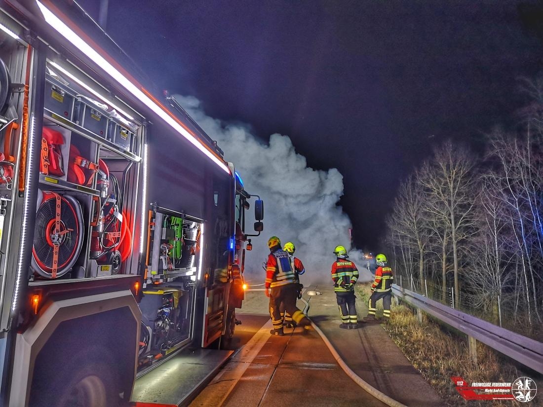 Gemeinsam mit der Feuerwehr Langquaid wurden wir am späten Donnerstagabend zu einem brennenden Lkw auf die Autobahn 93 alarmiert. Geistesgegenwärtig kuppelte der Lkw-Fahrer noch seinen brennenden Anhänger ab. Mittels einem massiven Schaumeinsatz konnte der Brand unter Kontrolle gebracht und gelöscht werden. Während der gesamten Einsatzdauer war die Autobahn ab dem Dreieck Saalhaupt in Fahrtrichtung München komplett gesperrt. Für den Abtransport des ausgebrannten Lkw Anhängers wurde eine Fachfirma zur Bergung hinzugerufen. Verletzt wurde glücklicherweise niemand.