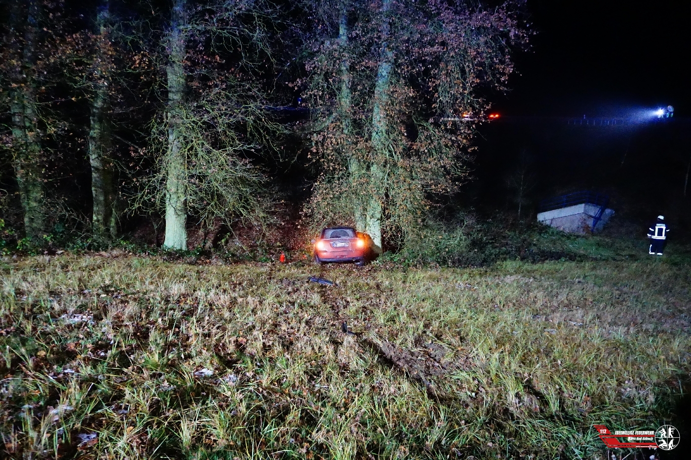 Zu einem Verkehrsunfall mit einer vermeintlich eingeklemmten Person wurden wir auf die Autobahn 93 Höhe Dreieck Saalhaupt alarmiert. Diese Meldung bestätigte sich vor Ort glücklicherweise nicht, die Person war nicht eingeklemmt. Die ebenfalls mitalarmierte Feuerwehr Teugn konnte die Anfahrt abbrechen. Der Fahrer des Fahrzeugs wurde verletzt und durch den mitalarmierten Rettungsdienst in ein nahegelegens Krankenhaus verbracht. Zum Unfallhergang können keine genaueren Angaben gemacht werden, lediglich dass das Fahrzeug rund 70m von der Fahrbahn entfernt in einem Abgrund stand. Für die Arbeiten des Bergeunternehmens wurde die Unfallstelle weitflächig ausgeleuchtet, sowie die Fahrbahn abgesichert.