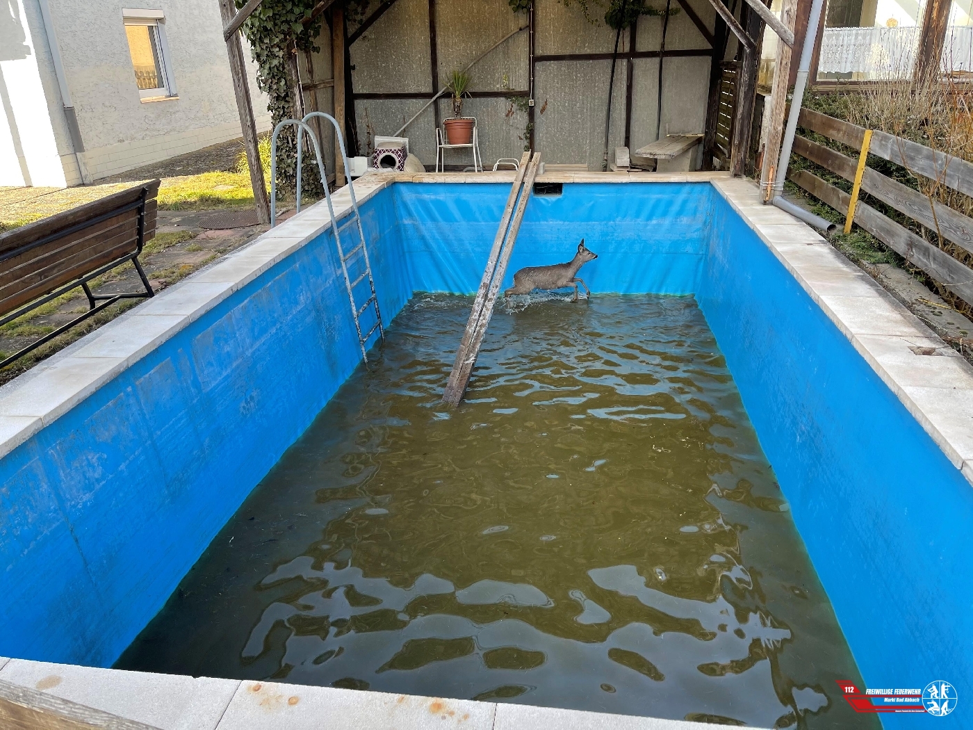 Um 14:29 Uhr wurden wir telefonisch über ein Reh in einem Pool informiert. Beim Eintreffen der Führungsdienstgrade konnte ein aufgebrachtes Reh in einem circa zwei Meter tiefen Pool vorgefunden werden. Bevor weitere Maßnahmen in die Wege geleitet wurden, konnte sich das Tier jedoch selbstständig aus der Lage retten. Bei dem Fluchtversuch wurde jedoch das Reh zwischen einem Gartenhaus und einem Gartenzaun eingeklemmt, worauf es von der Feuerwehr befreit werden musste, bevor es anschließend in einen Wald flüchten konnte.