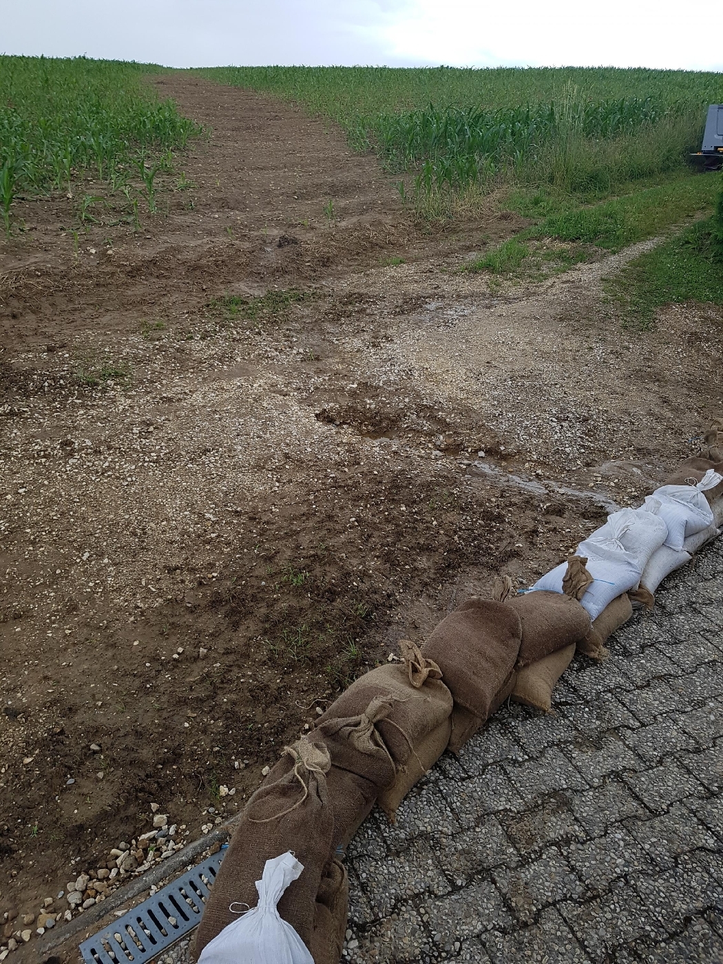 Nach den Regenfällen der letzten Stunden drohte ein Gebäude welches beim Unwetter vom 05. Juni schon schwer getroffen wurde erneut vollzulaufen, mittels einer Sandsackbarierre wurde dem Abhilfe geschaffen.