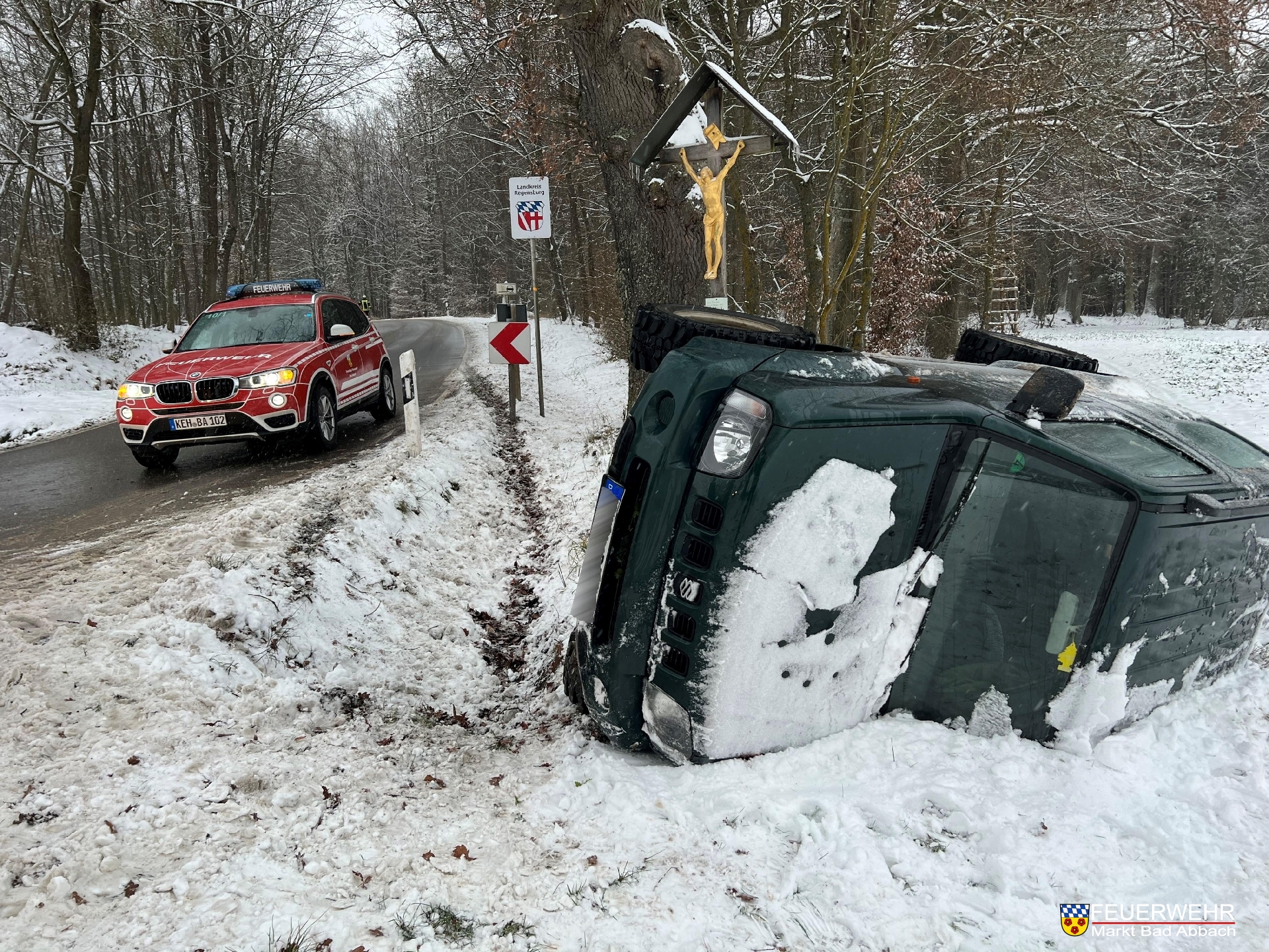 Ein alleinbeteiligter Pkw kam von der Fahrbahn ab und kippte zur Seite um. Der Fahrer des Kleinjeep wurde nicht verletzt.
