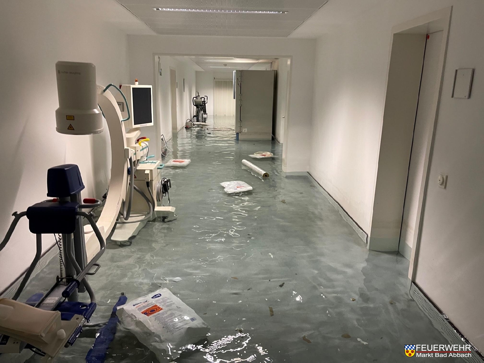 Ausgehend der automatischen Brandmeldung des Einsatz Nummer 057 wurde ab 18:25 Uhr die Einsatztaktik auf einen größeren Wasserschaden im Gebäude geändert. Aufgrund einer zügigen Auskunft des Wasserzwecksverbandes stand fest, dass es zu einem Defekt der Zuwasserleitung des Klinikums gekommen sein muss. Eine detailierte Ursachenerkundung war aufgrund der Wassermaßen, welche auf die Türen drückten, nicht möglich. Nach ersten Hochrechnungen wurde von einer Summe von rund 400.000 Liter Wasser ausgegangen, was durch den Pegel von knapp 70cm ersichtlich wurde und welche es aus dem rießigen Kellerkomplex zum pumpen galt.