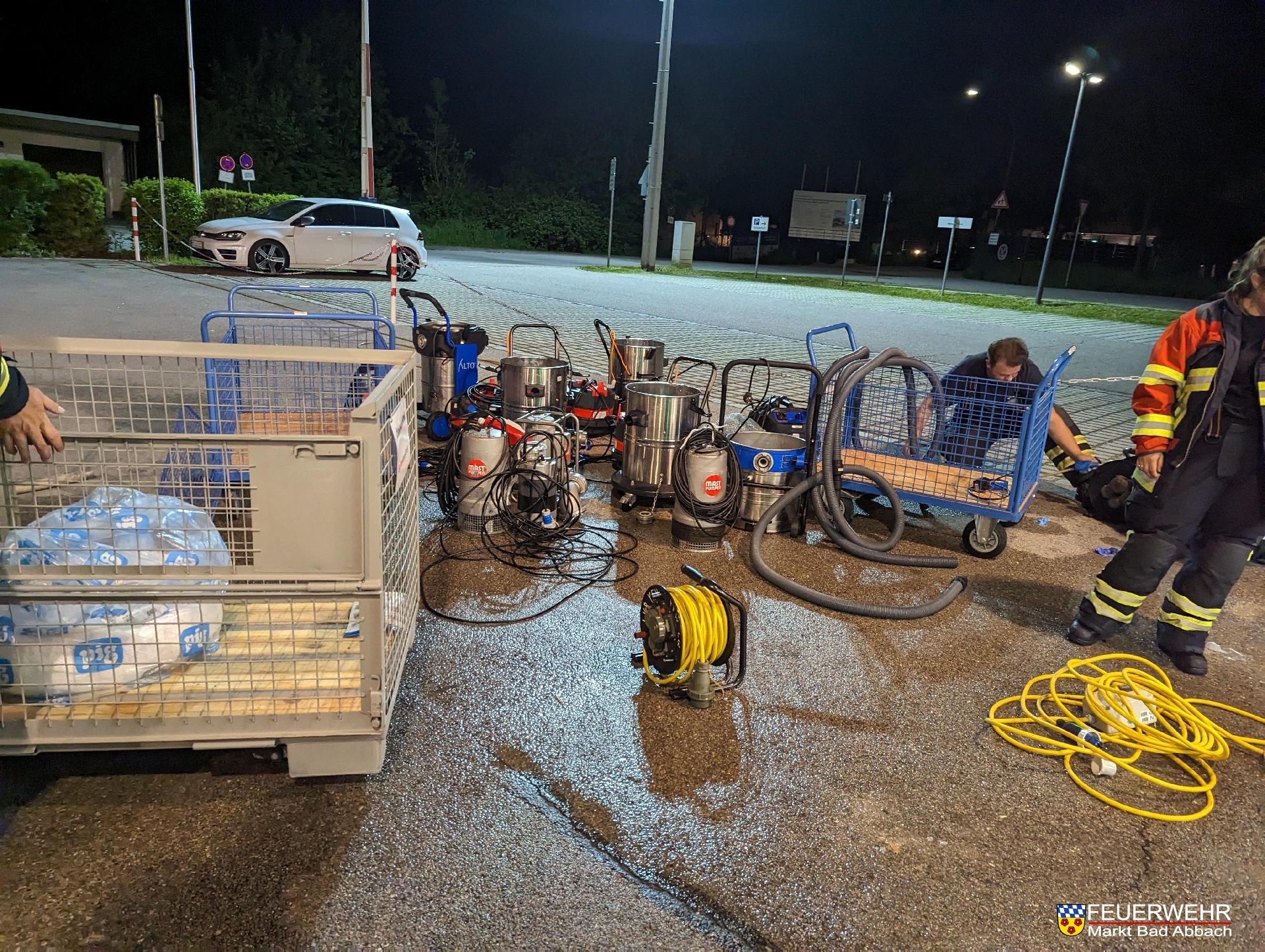 Eine Vielzahl an Spezialpumpen und Saugern wurde durch den Versorgungs-Lkw an die Einsatzstelle nachgeführt. Mit einem massiven personellen Aufwand und der Einteilung verschiedener Abschnitte konnten innerhalb der ersten Stunde Erfolge der Pumpmaßnahmen festgestellt werden.