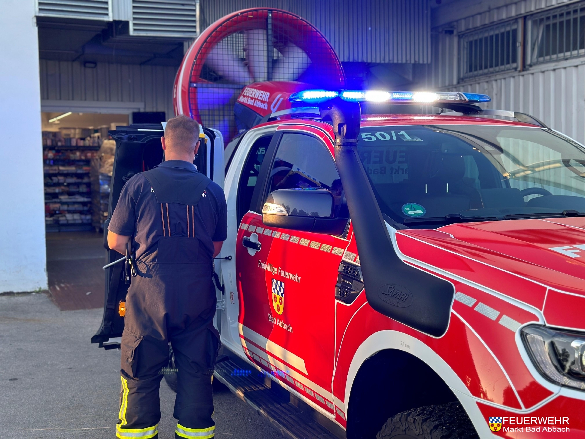 Gegen 19:50 Uhr wurden wir telefonisch mit dem Großventilator nach Abensberg in die Straubinger Straße nachgefordert. Ein Container am Einkaufszentrum geriet in Brand und verrauchte das Objekt großflächig.