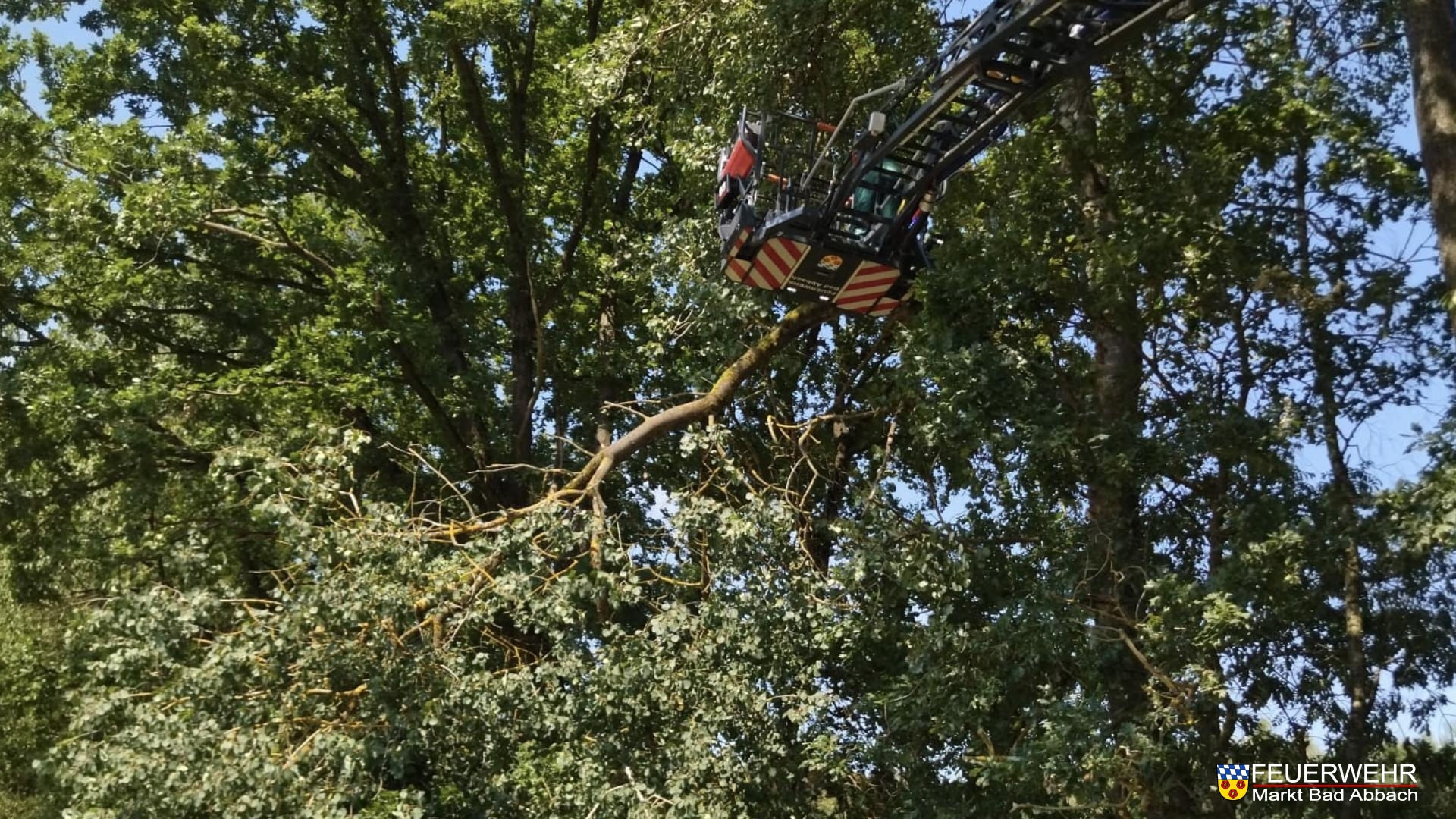 Da der Ast bereits weit in die Fahrbahn ragte, wurde diese Gefahrenstelle mit Hilfe der Drehleiter beseitigt.
