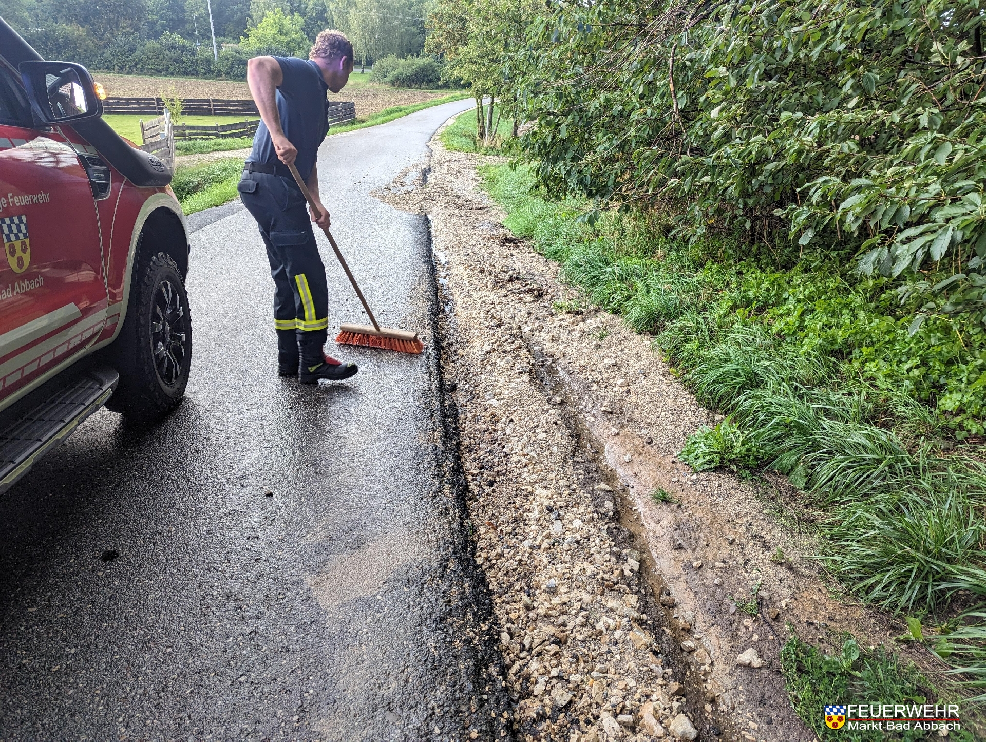 Ein Starkregenereignis verschmutzte die Stinkelbrunnstraße über eine Länge von rund 100 Metern mit Geröll. Die Hindernisse wurde beseitigt.