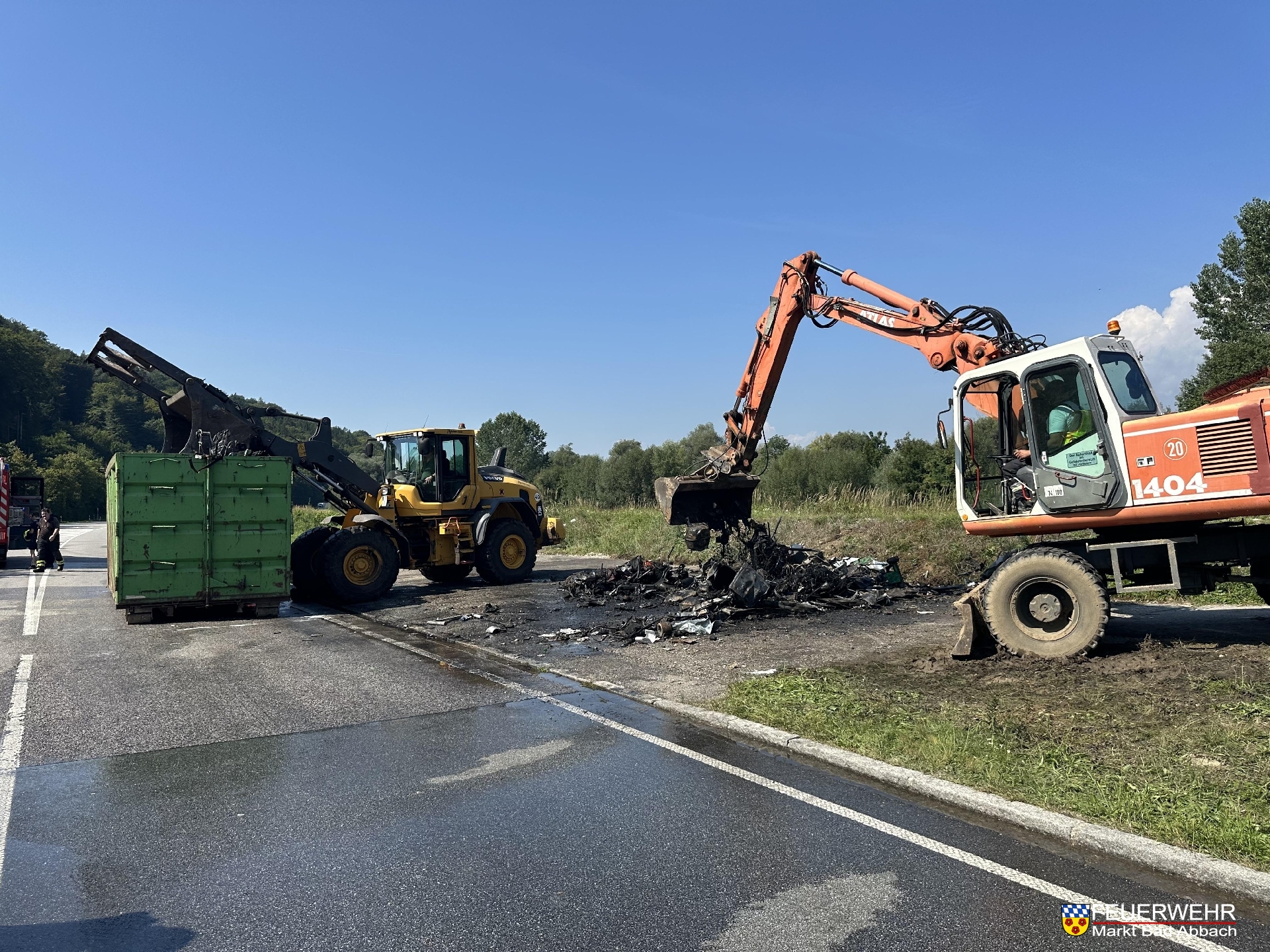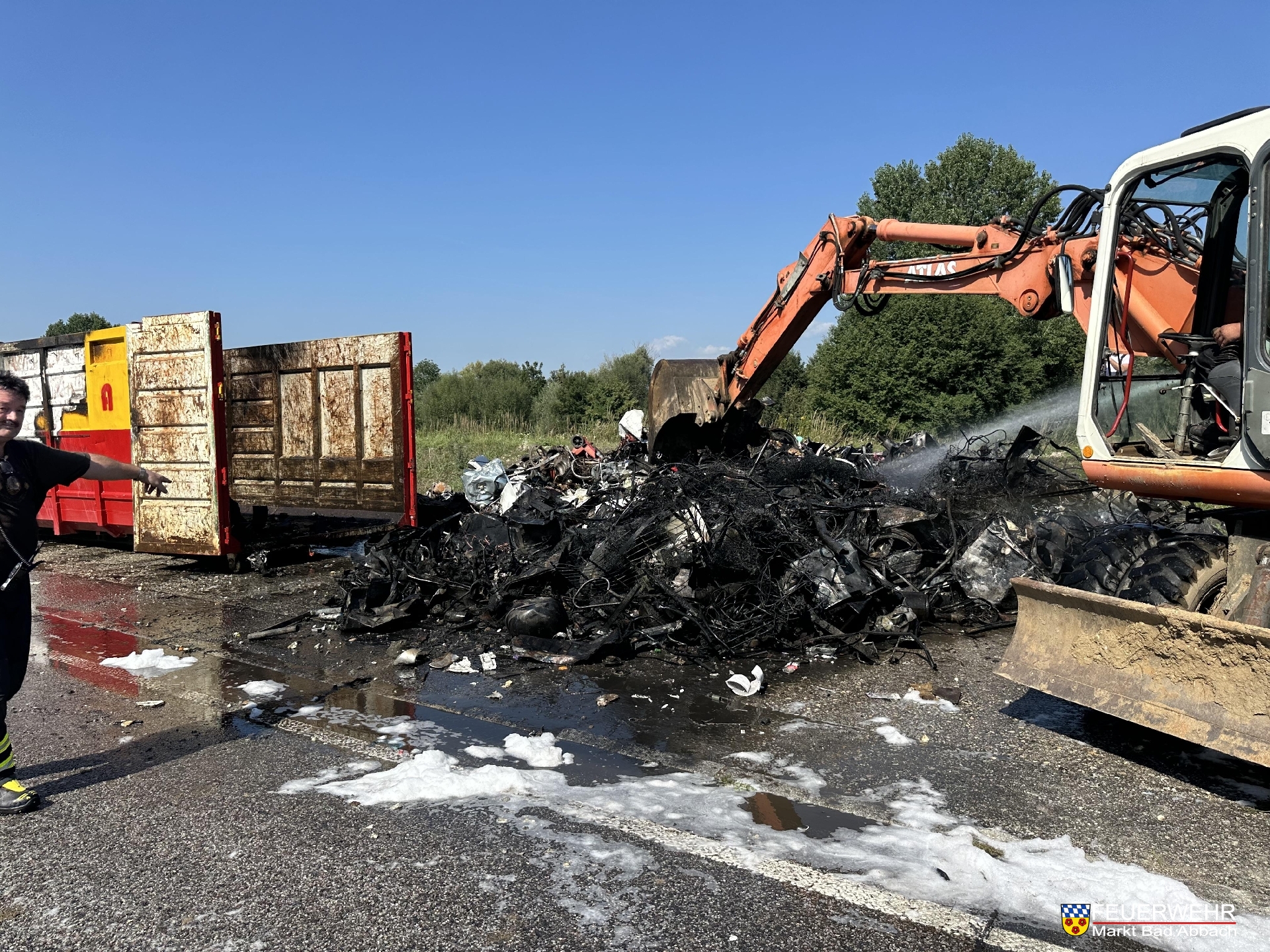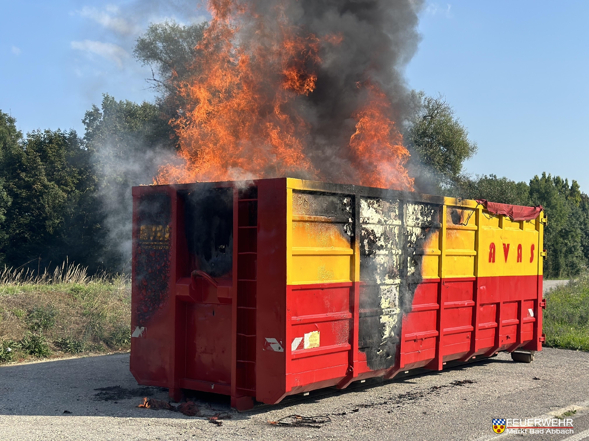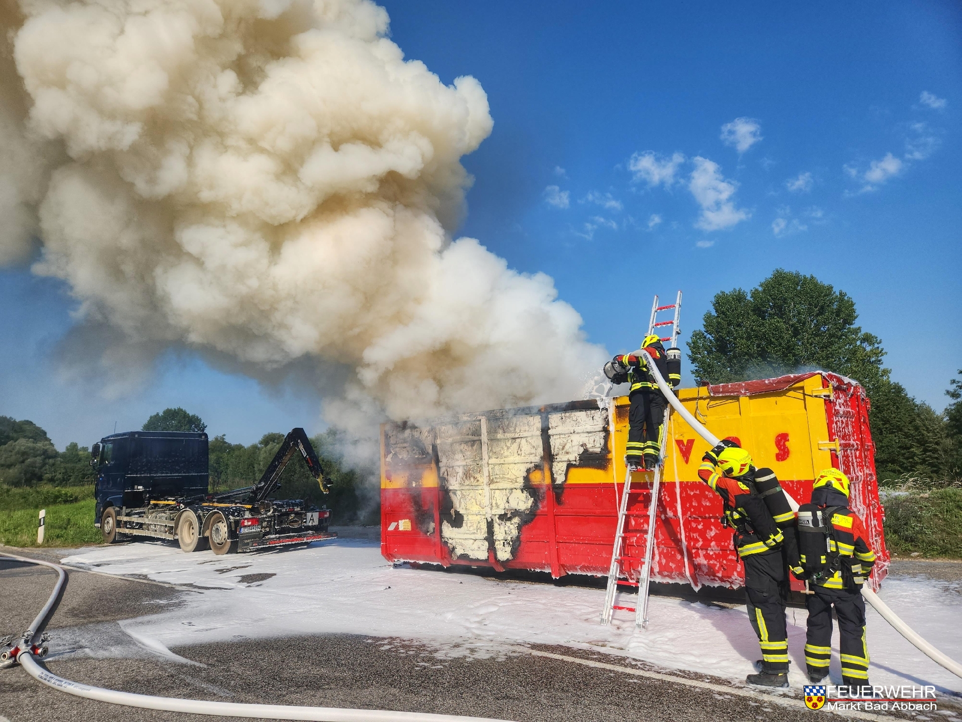 An der Einsatzstelle stellte sich heraus, dass es sich um einen bereits abgesattelten Absetzcontainer handelt, in welchem Sperrmüll aus ungeklärter Ursache in Brand geraten war.