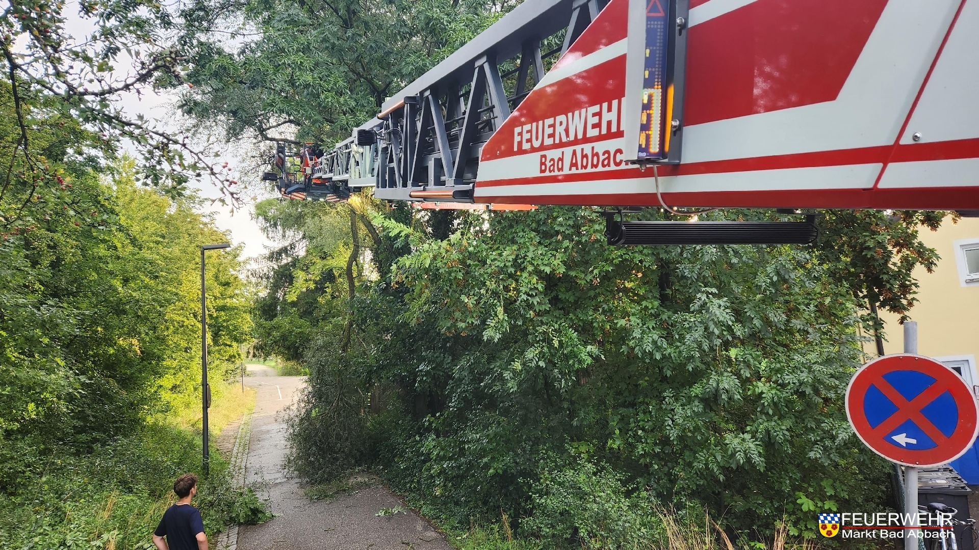 Am heutigen Freitagmorgen mussten wir den örtlichen Bauhof mittels Drehleiter unterstützen. Nach dem Unwetter vergangene Nacht, hing ein größerer Ast in eine Straße und blockierte diese.