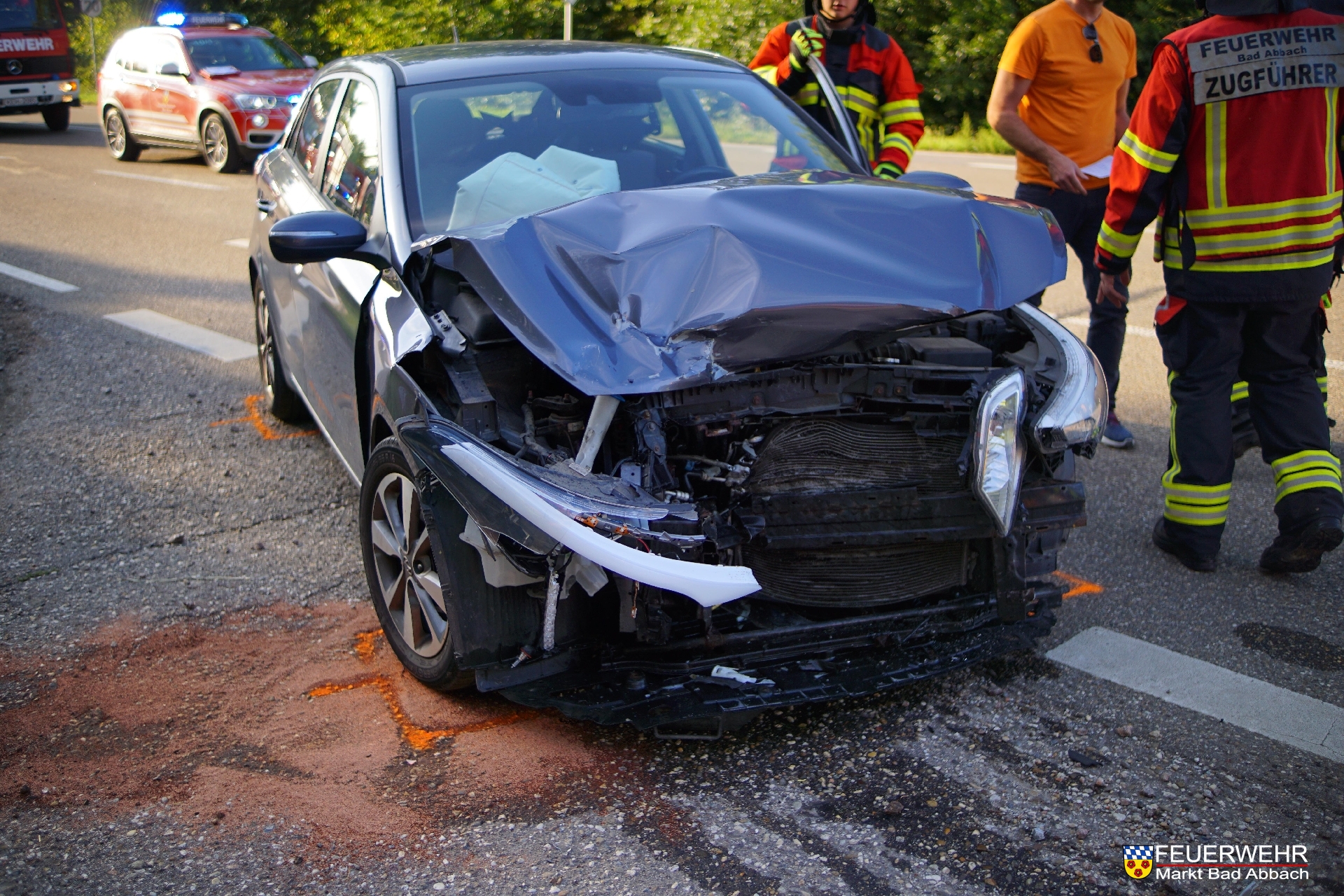 Die Feuerwehr Poign forderte uns nach zu einem Verkehrsunfall zwischen zwei Fahrzeugen zum Kreuzungsbereich Staatsstraße 2143 und Kreisstraße R4. Wir stellten den Brandschutz sicher, banden auslaufende Betriebsstoffe und unterstützen die Kameraden der Feuerwehr Poign bei Verkehrslenkungsmaßnahmen. Zwei Personen wurden bei dem Unfall verletzt und wurden durch den Rettungsdienst in umliegende Krankenhäuser eingeliefert. Die zwei verunfallten Pkw wurden durch Abschleppdienste abgeschleppt.