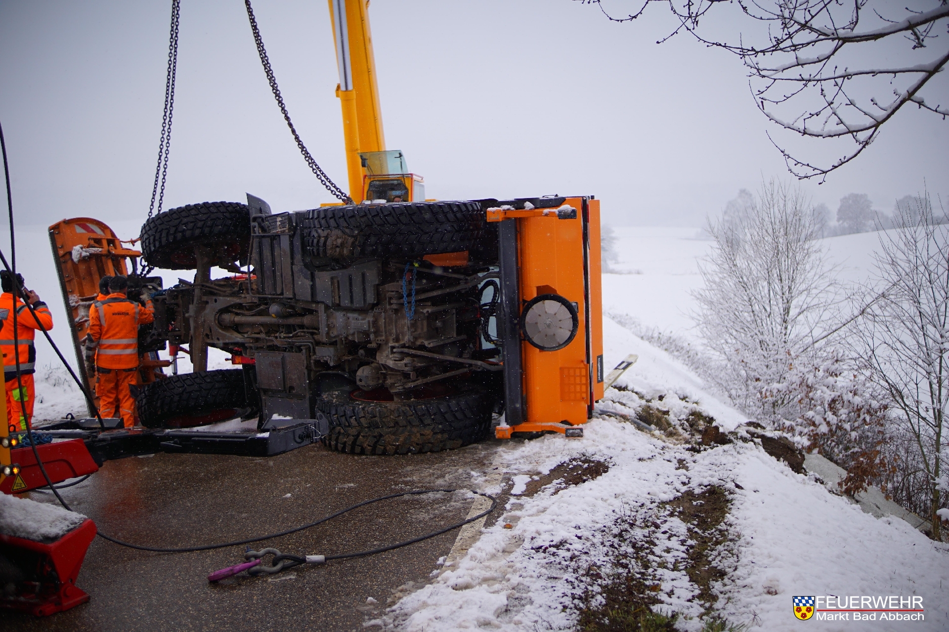 Der Fahrer eines Räumfahrzeuges verlor die Kontrolle und rutschte in den Graben und kippte darauhin zur Seite um.