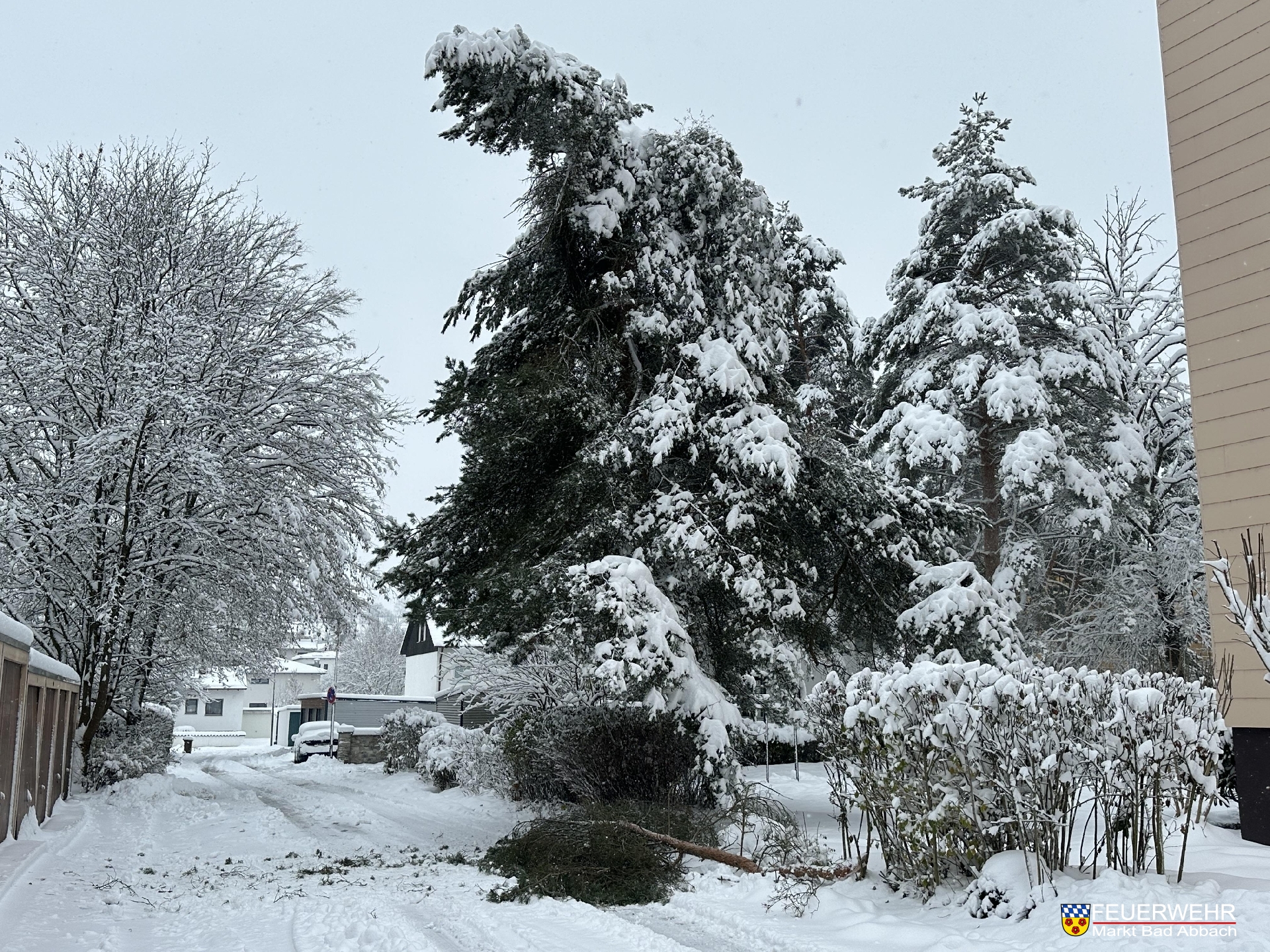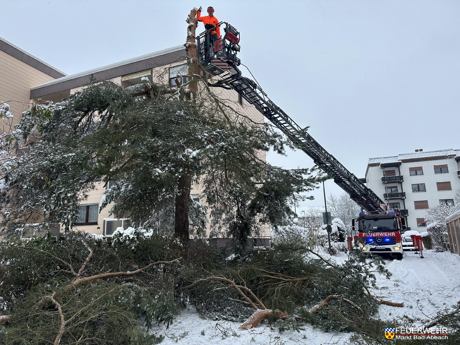 Eine größere Kiefer brach aufgrund der Schneelast ab und musste mit Hilfe der Drehleiter und einer Motorsäge abgetragen werden, da eine Gefahr für Fußgänger und Verkehr bestand.