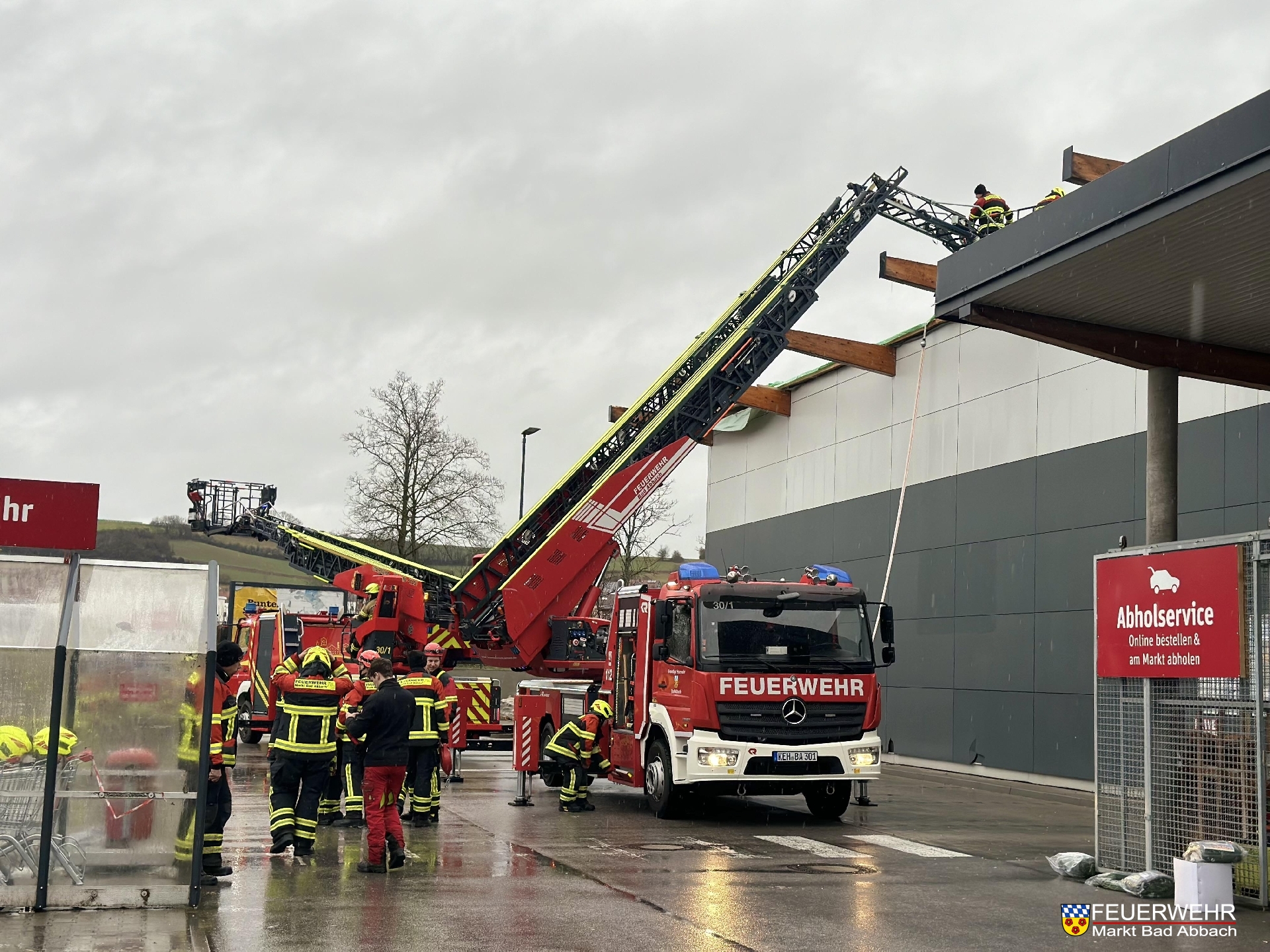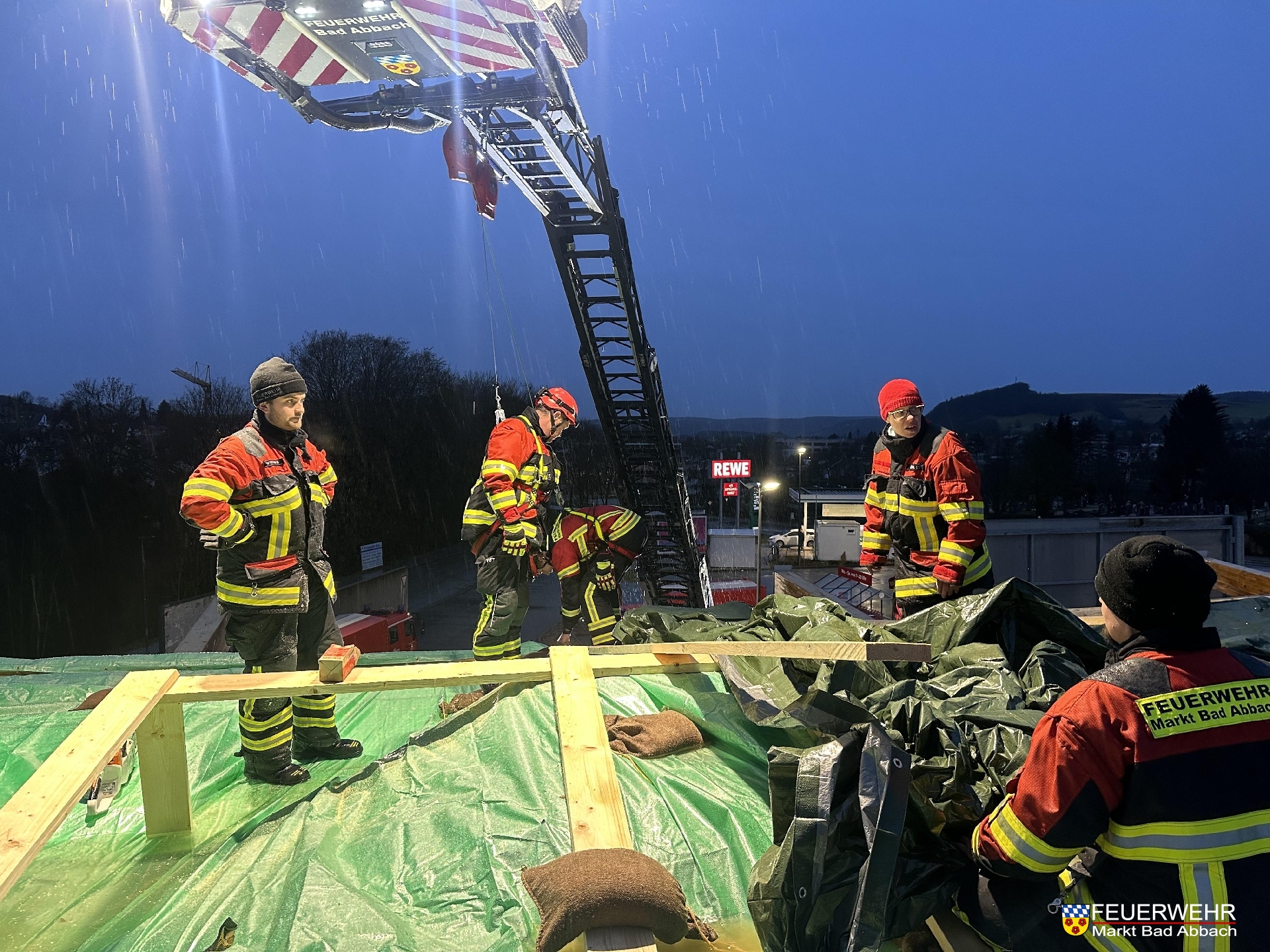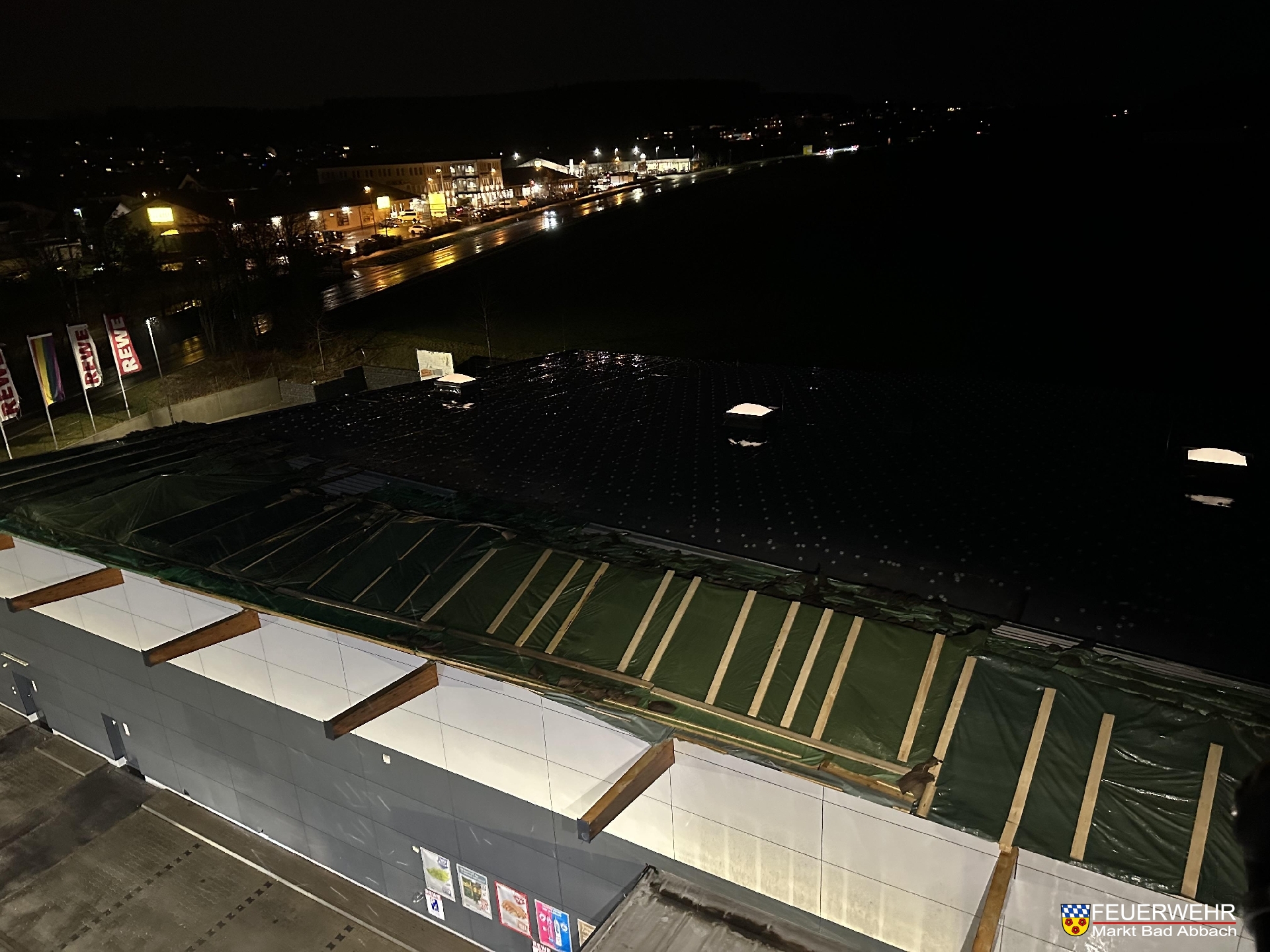 Um 10:50 Uhr wurden wir erneut zum REWE Verbrauchermarkt in die Finkenstraße gerufen. Der Dauerregen der vergangenen Stunden drang trotz dem provisorischen Dach vom 23. Dezember in das Objekt ein.