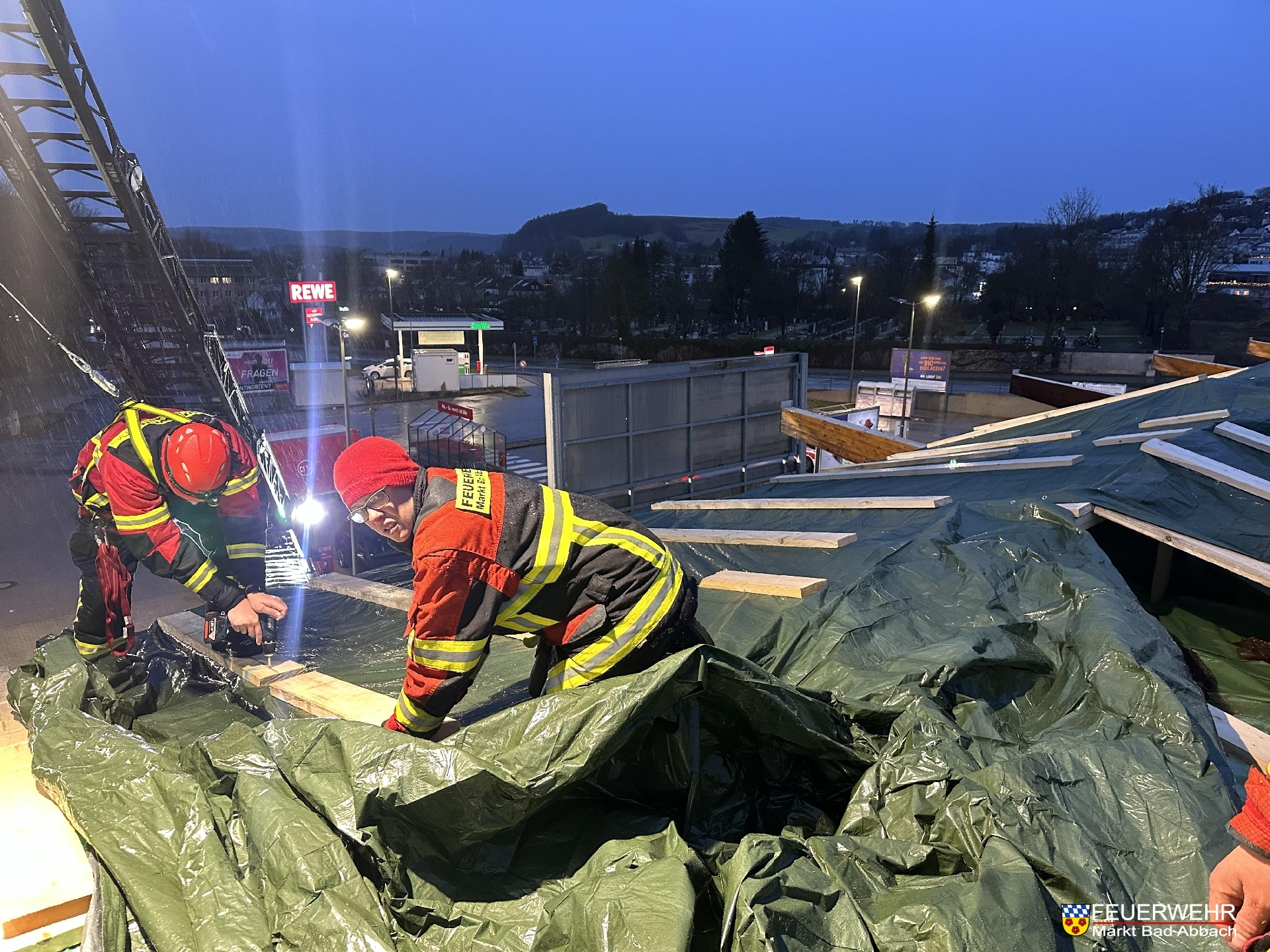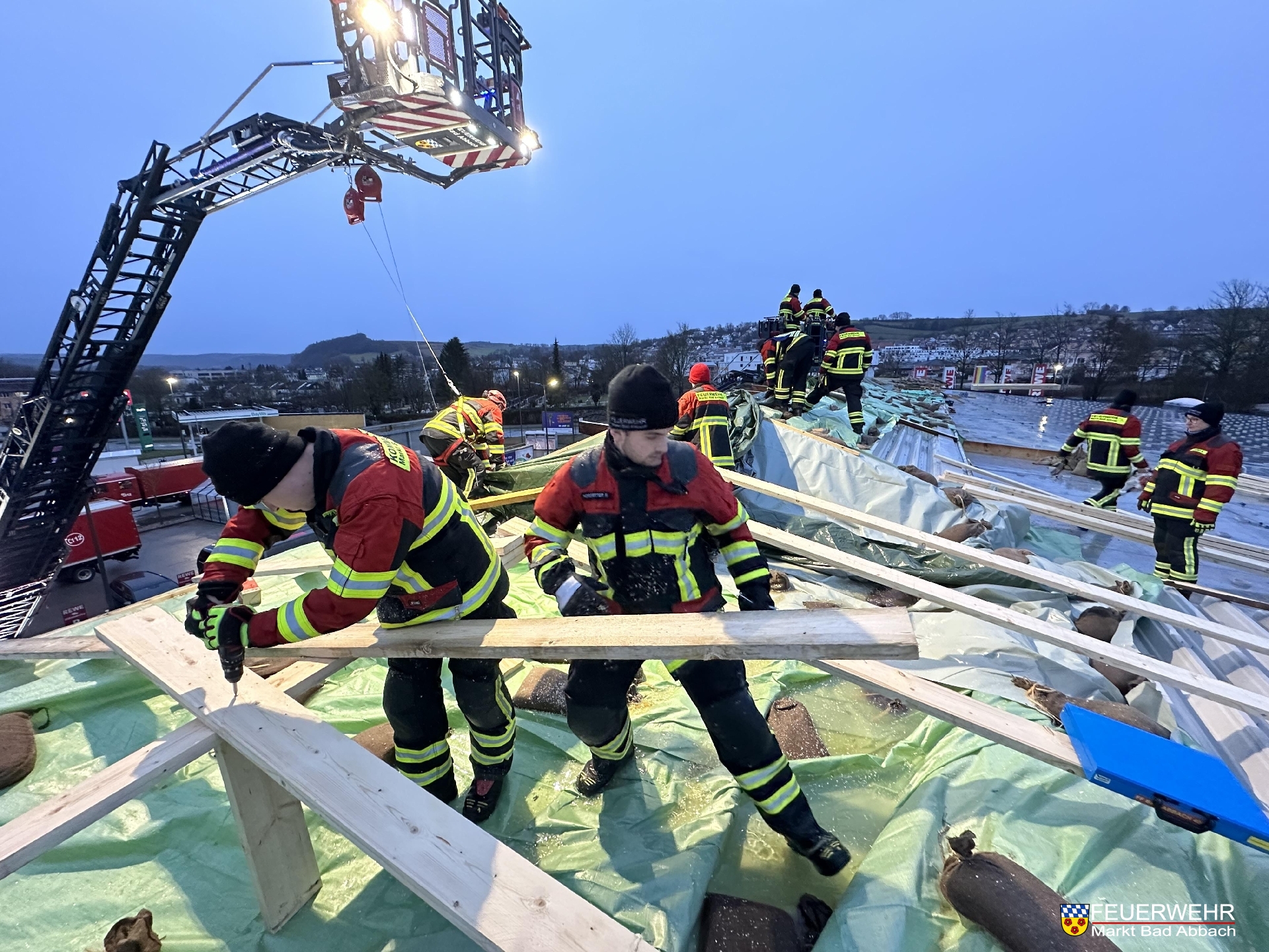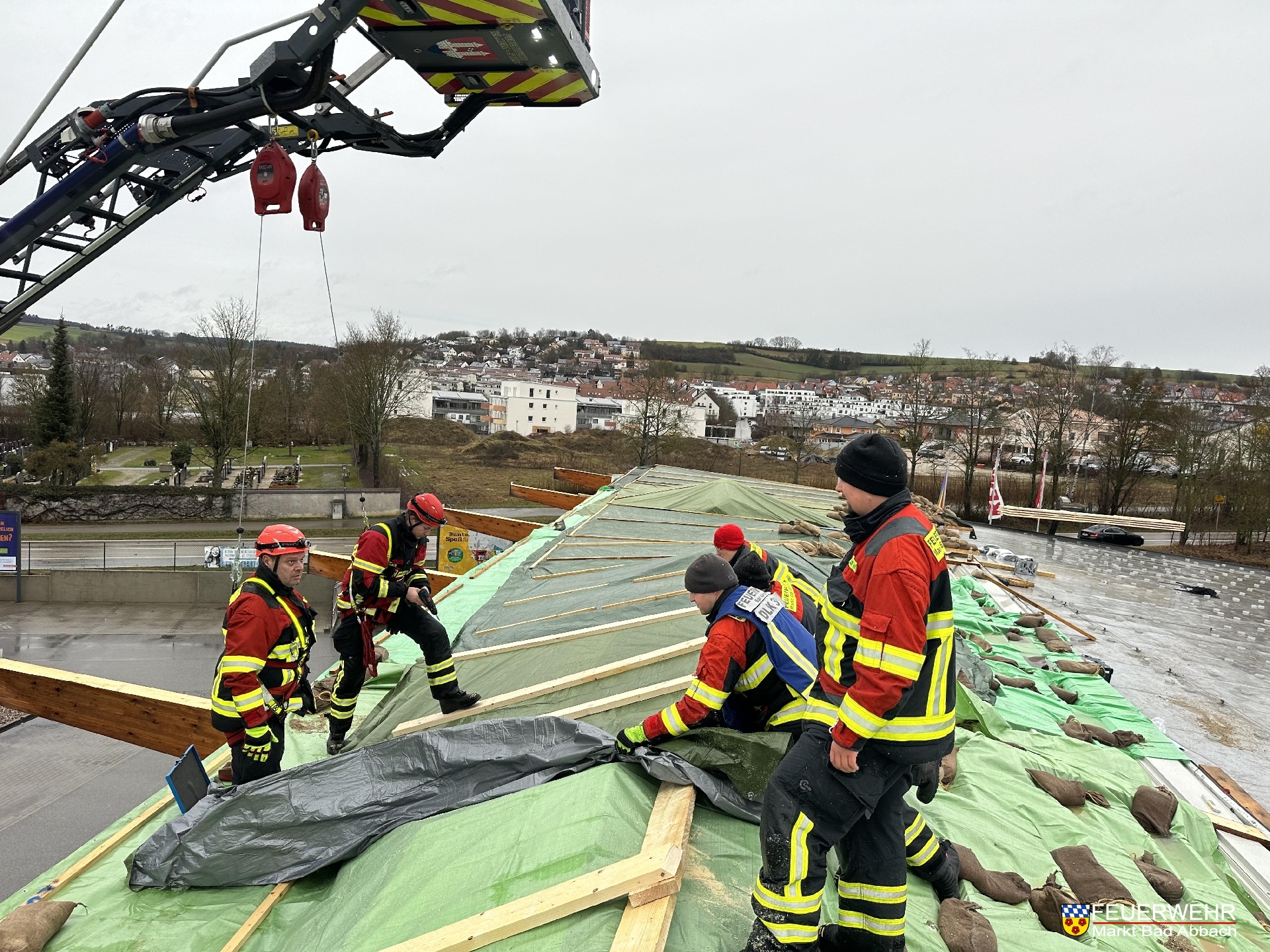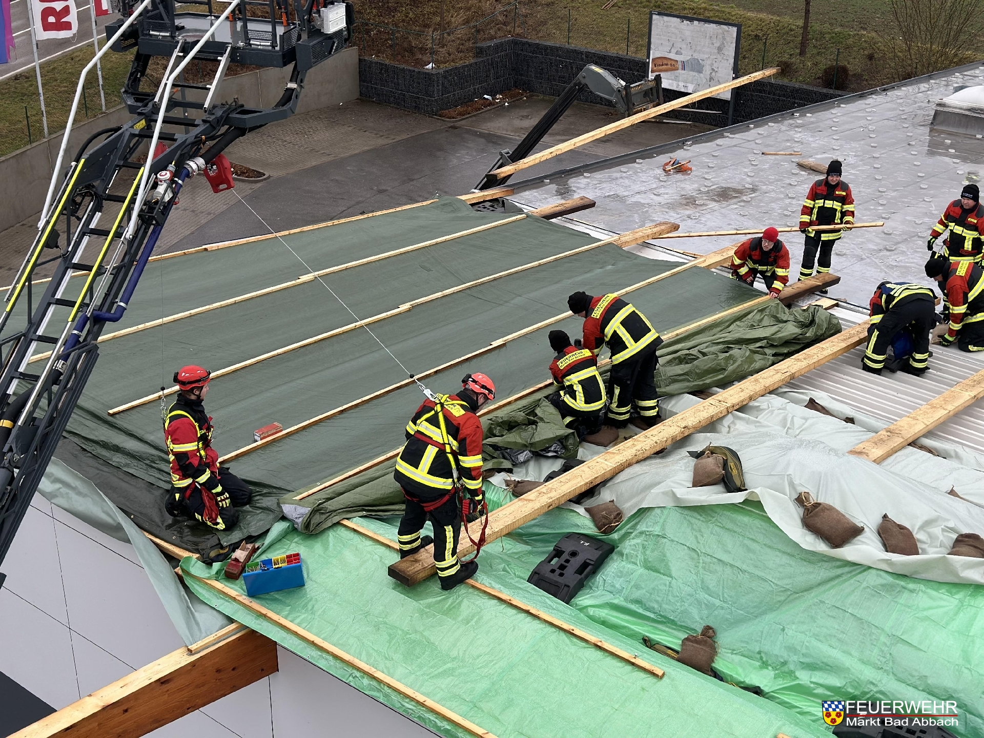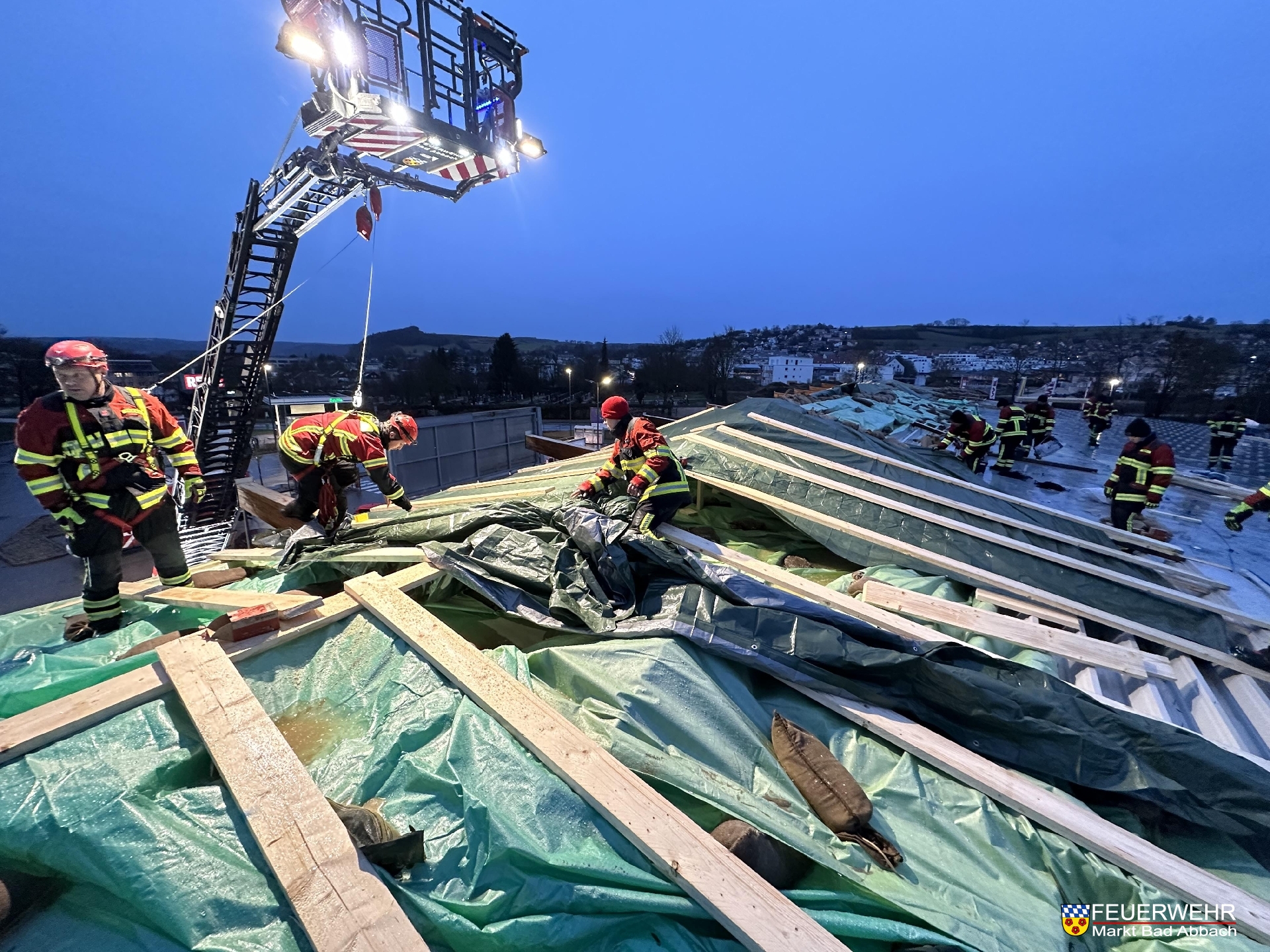 Durch den Einsatz unserer und der Drehleiter der Feuerwehr Kelheim-Stadt und vielen handwerklichen Händen wurde innerhalb 7 Stunden ein provisorischer Dachstuhl über die knapp 60 Meter breite Schadensstelle gebaut.