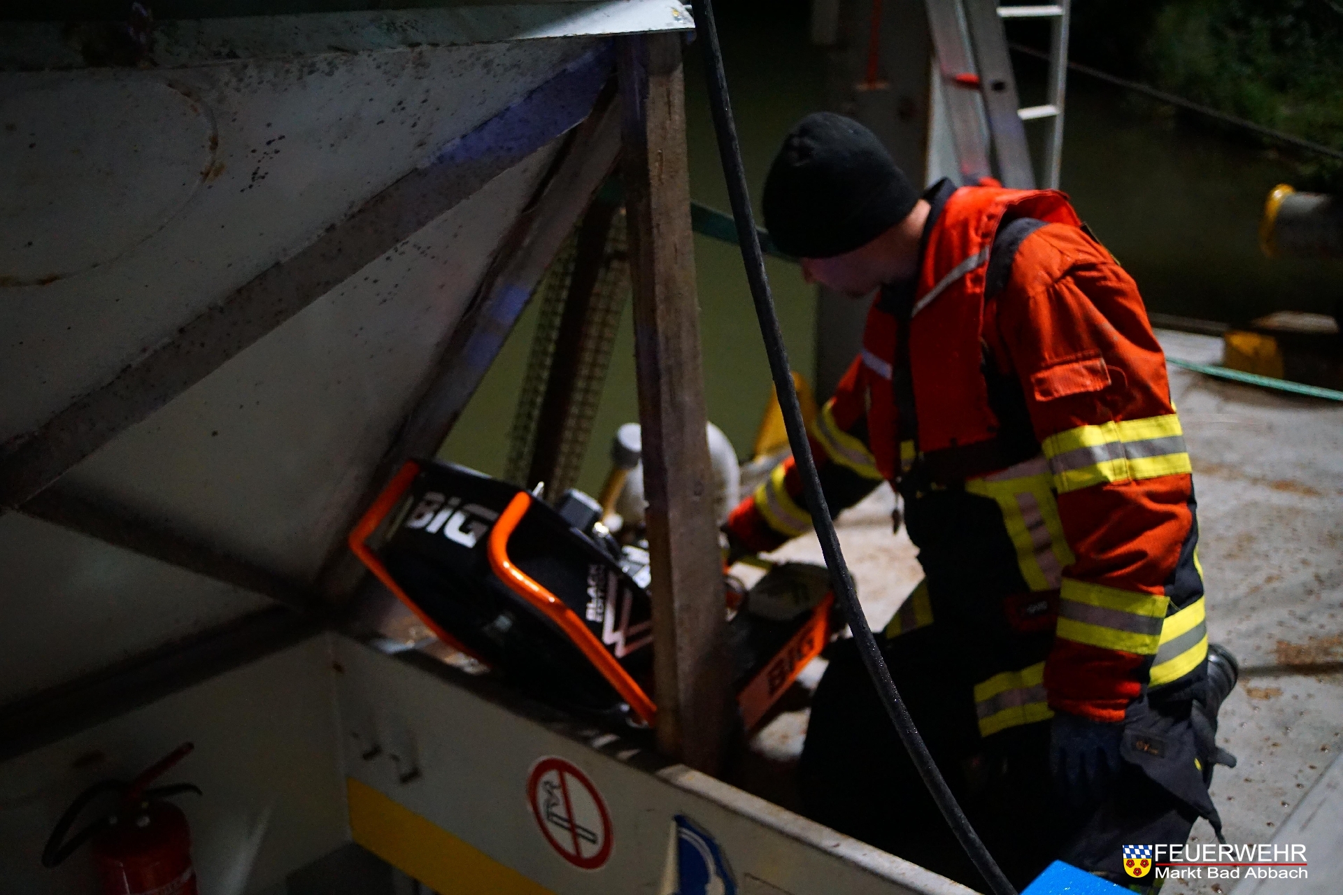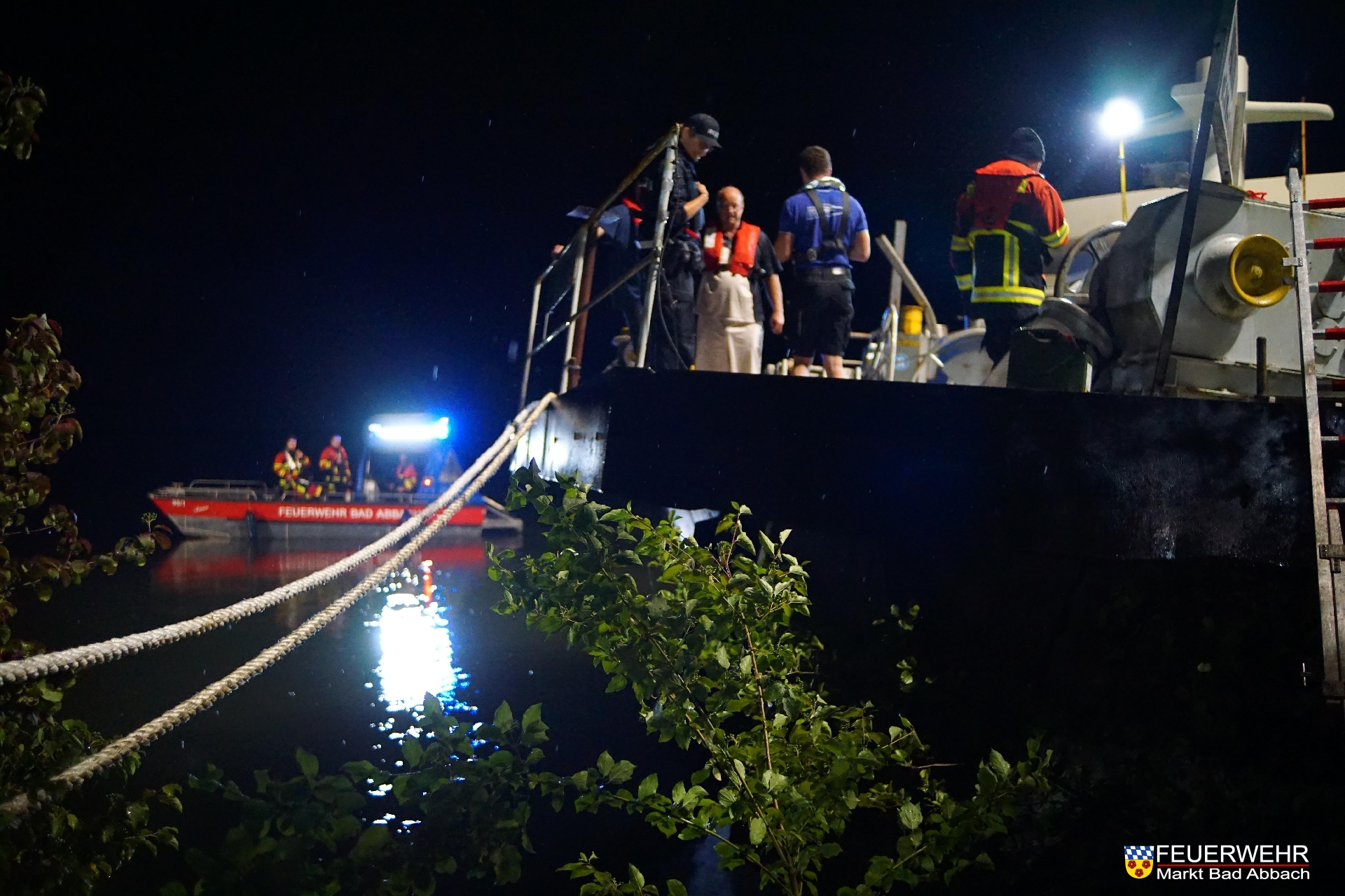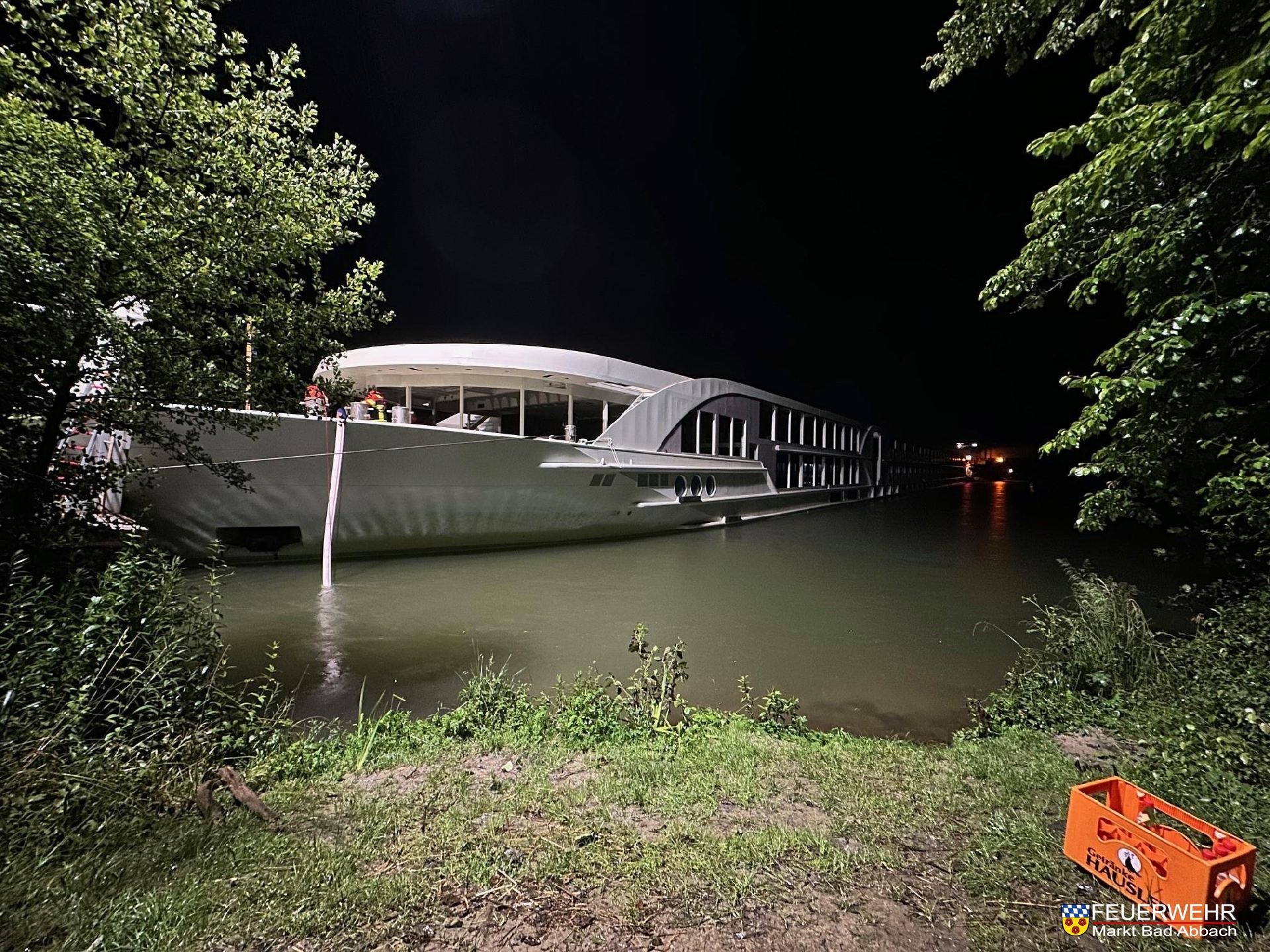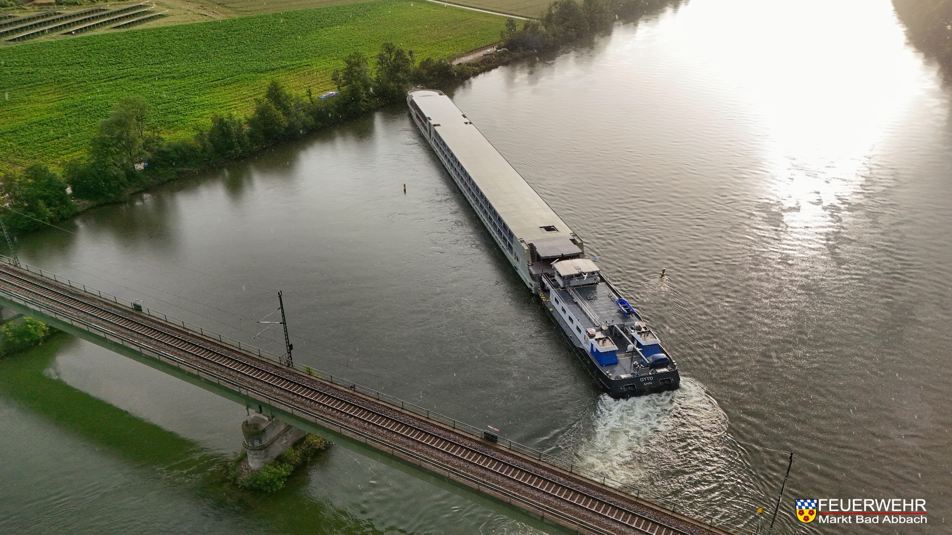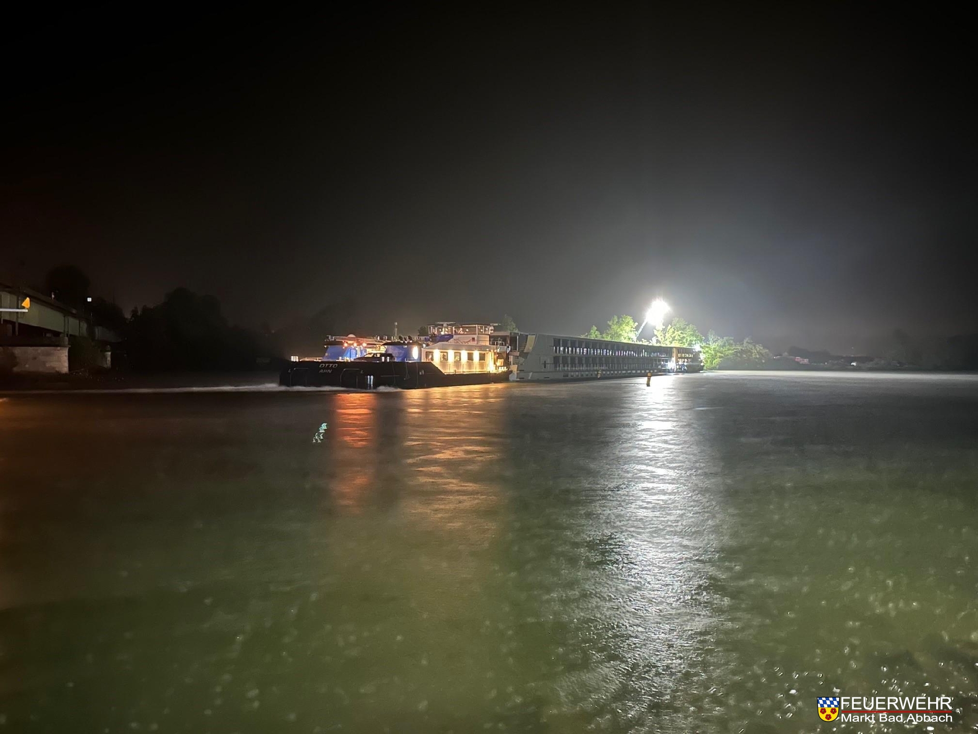 Ein noch nicht selbstständig fahrtüchtiges und nur mit der Crew besetztes Personenschiff, welches von einem Schleppschiff bewegt wurde, havarierte aufgrund eines technischen Problems im Bereich der Einfahrt zum Bad Abbacher Schleusenkanal. Der Kapitän konnte das etwa 130 Meter lange Schiff noch so manivrieren, dass es mit dem Ufer Kontakt schließen konnte und so vorerst keine weitere Gefahr ausging. Aufgrund des Defekts drang dichter Rauch aus dem vorderen Maschinenraum. Ein Trupp unter schwerem Atemschutz stieg hinab, erkundete die Situation und konnte kein offenes Feuer feststellen. Eine Entrauchung wurde durchgeführt.