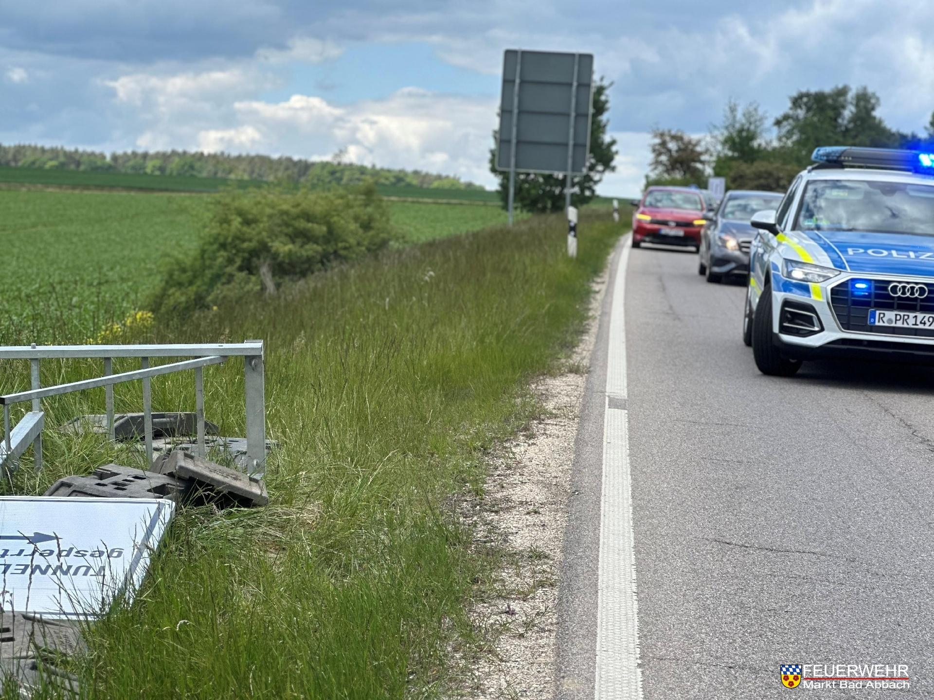 Gegen 14:10 Uhr erreichten uns mehrere Anrufe über ein durch Windböen umgestürtztes Verkehrsschild im Bereich der Ausfahrt Bad Abbach-Nord der Bundesstraße 16.