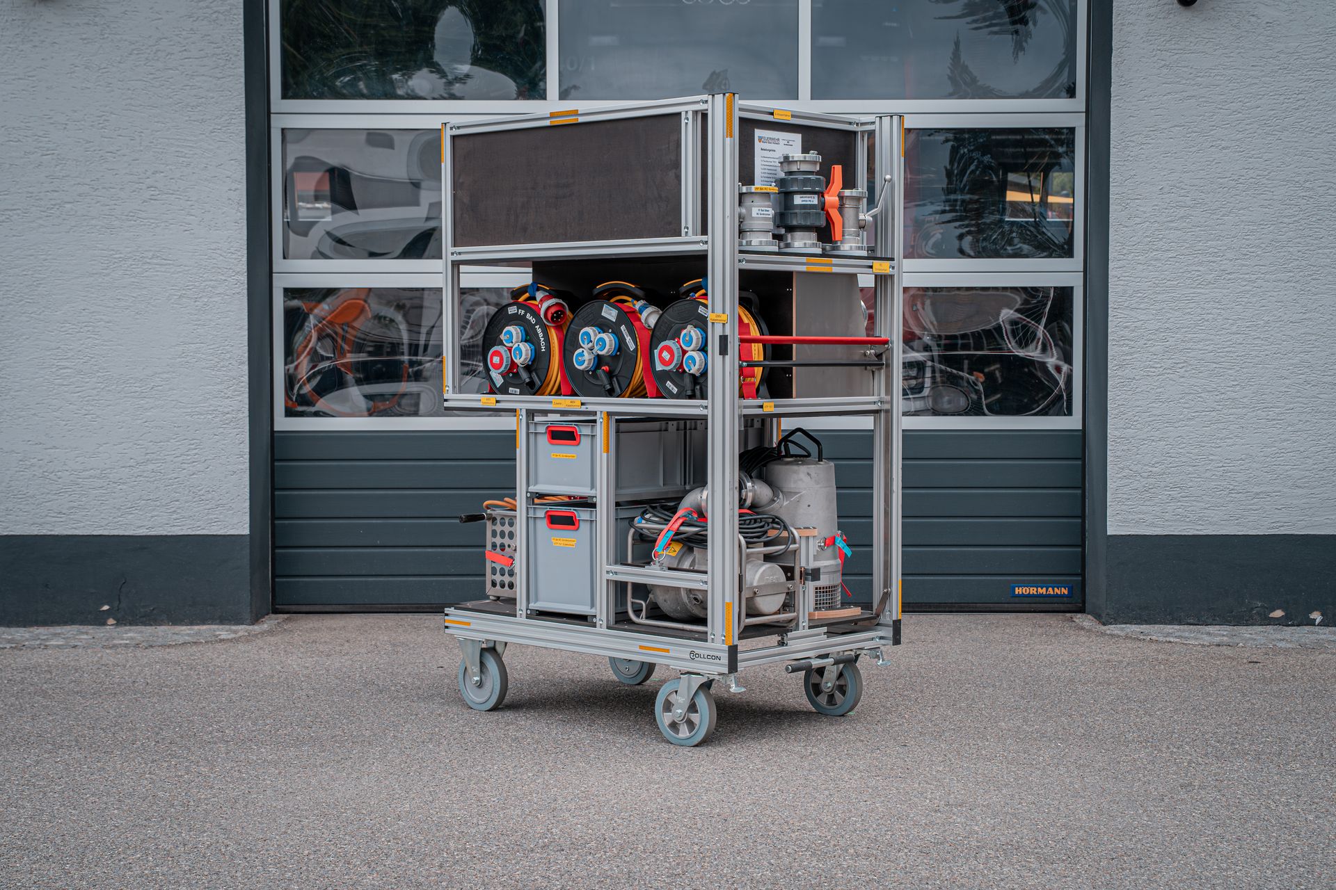 Mit den zwei am Standort befindlichen Rollcontainer Schlauch (á 500m B Druckschlauch) können lange Schlauchstrecken wie zum Beispiel Straßentunnel, abschüssige Objekte oder Wald und Wiesenwege verlegt werden. Im Einsatzfall können diese auf unseren V-LKW verlastet werden und so in Schrittgeschwindigkeit vom Fahrzeug aus verlegt werden. Zusätzlich führen diese Container Schlauchbrücken und einen Schlauchaufroller mit.
