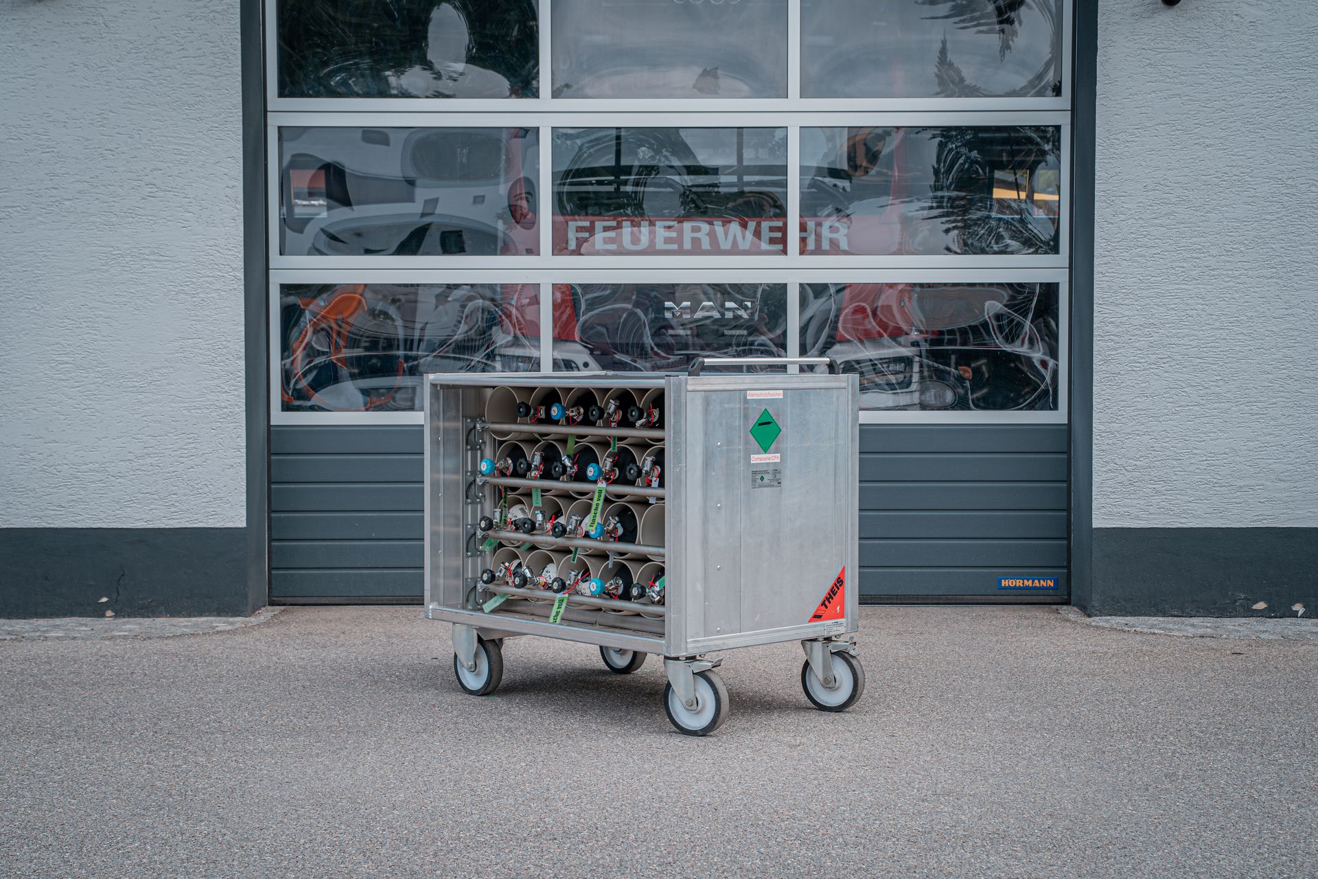Eigens für unseren Straßentunnel wurde im Jahr 2022 ein Rollcontainer Atemschutz angeschafft. Bei einem Brandfall rüsten sich Atemschutzträger mit den vier Langzeit Pressluftatmern aus und führen diesen anschließend mit in die Röhre. Neben einem 45m C-Schlauch befinden sich weitere Hilfmsittel, Armaturen und Werkzeuge auf diesem Container.