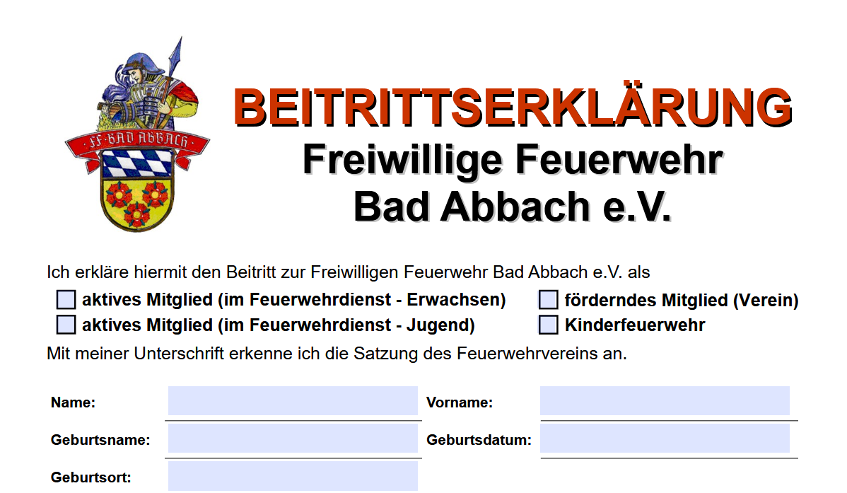 Dem Verein der Feuerwehr Bad Abbach kann jeder - unabhängig des Wohnsitzes - beitreten und der bereit ist, unsere Feuerwehr zu unterstützen. Ohne die finanzielle Unterstützung aus den Reihen der Bevölkerung wären viele Anschaffungen und Erleichterungen für unseren Dienst nicht möglich.